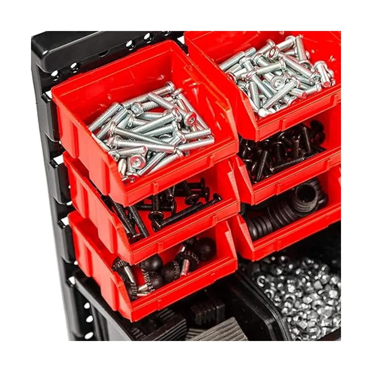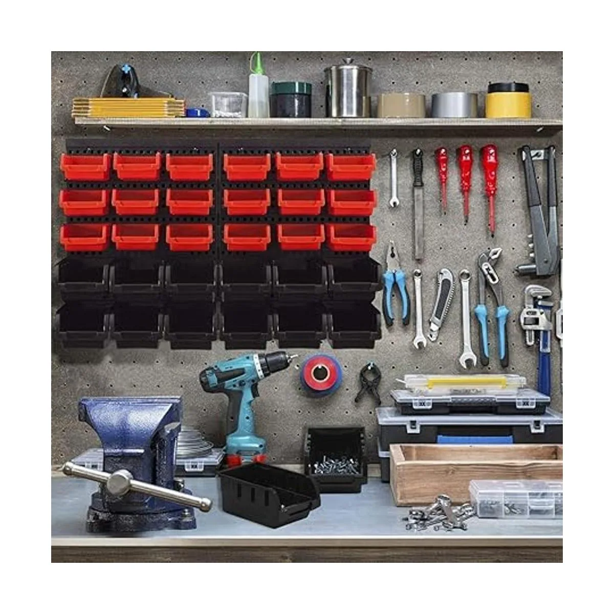 Contenedores de almacenamiento montados en la pared, 30 contenedores organizadores de herramientas de montaje en pared, contenedores de estante de piezas, compartimentos de fácil acceso para herramientas, hardware, manualidades, suministros de oficina y más, color rojo negro