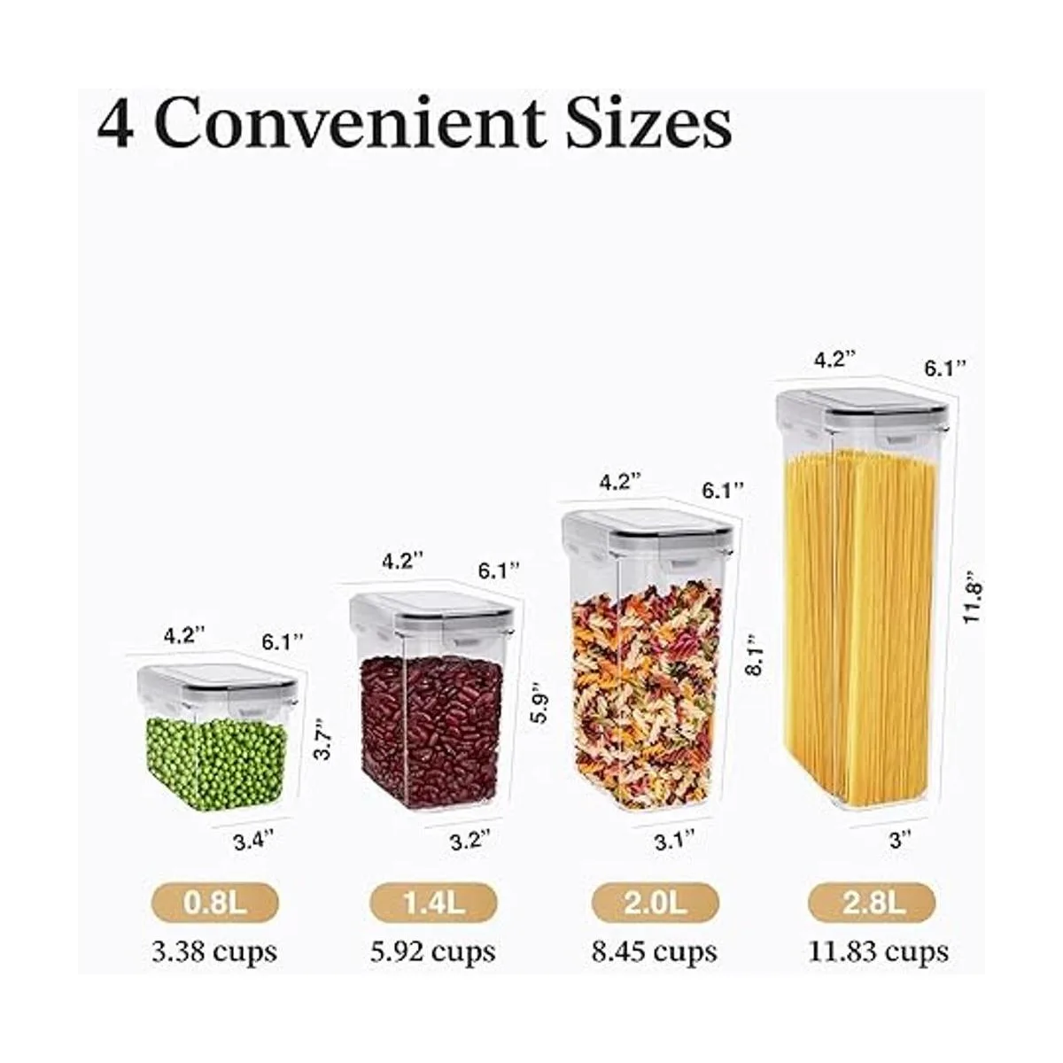 Versátil: incluye 1 recipiente extra grande 2.5 cuartos de galón/2.8 L, 2 recipientes grandes 1.8 cuartos de galón/2.0 L, 2 recipientes medianos 1.2 cuartos de galón/1.4 L, 2 recipientes pequeños 0.7 cuartos de galón/0.8 L. Estos recipientes herméticos vienen en una amplia variedad de formas y tamaños para la organización del hogar y la cocina.