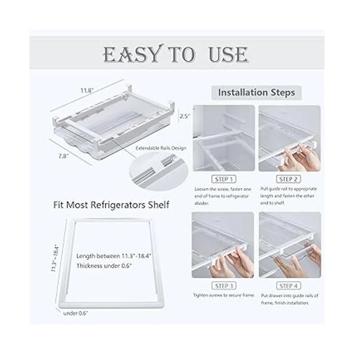 Se adapta a la mayoría de refrigeradores: el recipiente mide 11.8 x 8 x 2.5 pulgadas. Los rieles de marco extensibles hacen que sea adecuado para todos los estantes de refrigerador con una profundidad de 11.3 a 18.4 pulgadas y un grosor de menos de 0.6 pulgadas. Fácil de instalar en segundos sin herramientas.