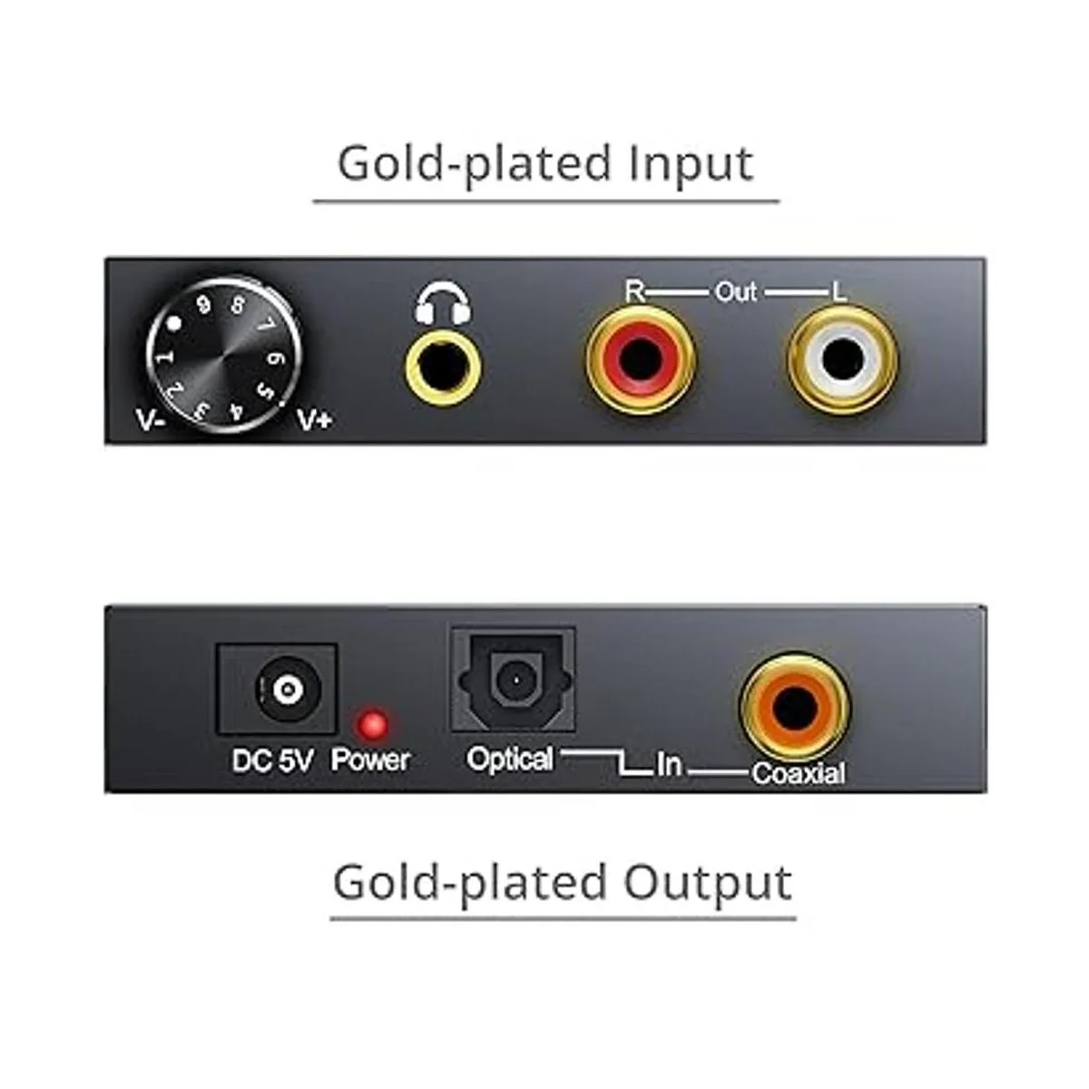 Goldplated input output gold Plated interface to reduce signal transmission loss. Input Audio connector: 1 x Toslink included 1m 4. 0/OD slink cable, 1 x RCA coaxial; output audio connector: 2 x RCA/L, 1 x 3. 5mm jack.