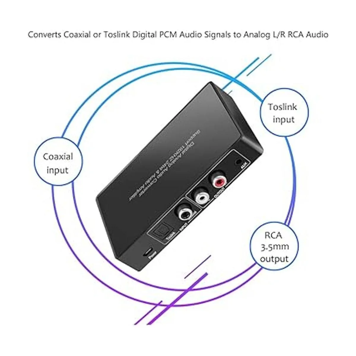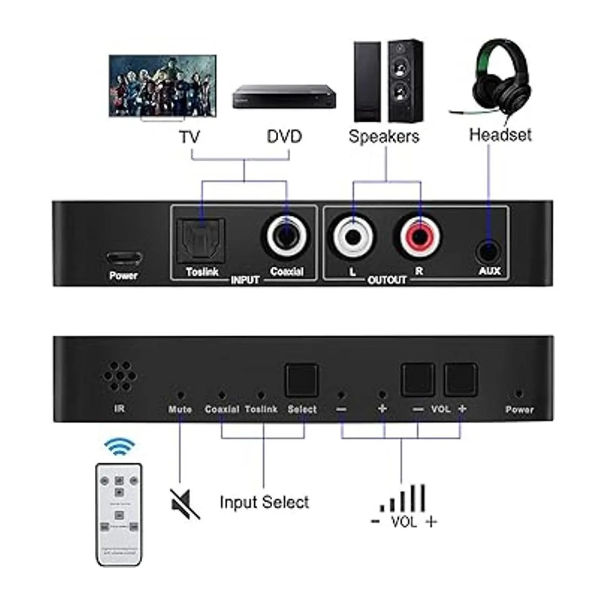 Convertidor de audio digital a analógico: convierte audio coaxial/Toslink/óptico a audio analógico L/R con salida de audio de 0.138 in, no es capaz de ser invertido; se puede conectar al audífono, amplificador de auriculares