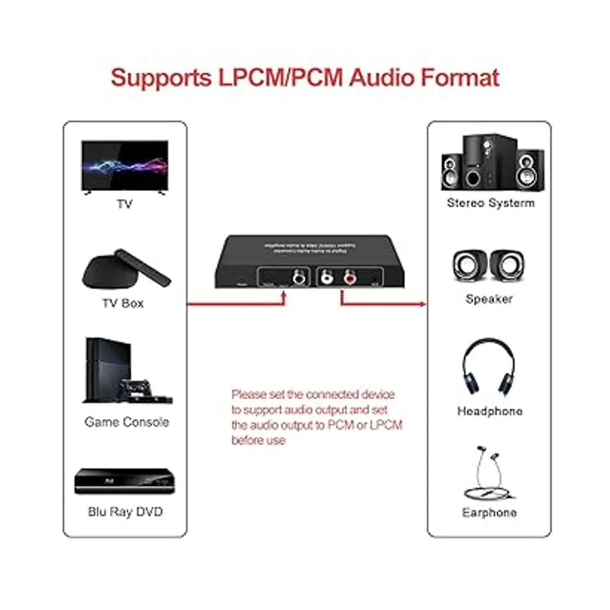 Convierte audio coaxial/Toslink/óptico a audio analógico L/R con salida de audio de 0.138 in, no es capaz de ser invertido; se puede conectar a los auriculares, amplificador de auriculares.