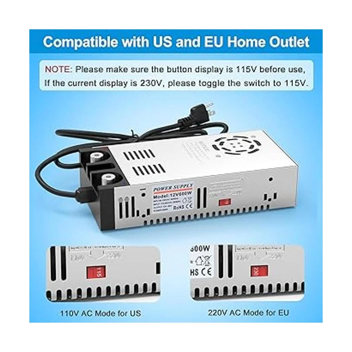 Voltaje de entrada dual: el voltaje de entrada soporta CA 110 V120 V y 220 V240 V. Rango de salida 12 V, 1A5A/12W60W o 12 V, 10A50A/120W600W. La entrada de voltaje se ajusta automáticamente al modelo SMPS, la corriente de salida depende principalmente de tu dispositivo, como 10A/120W, 20A/240W, 30A/360W. Corriente máxima de hasta 50 A, potencia de 600 W.