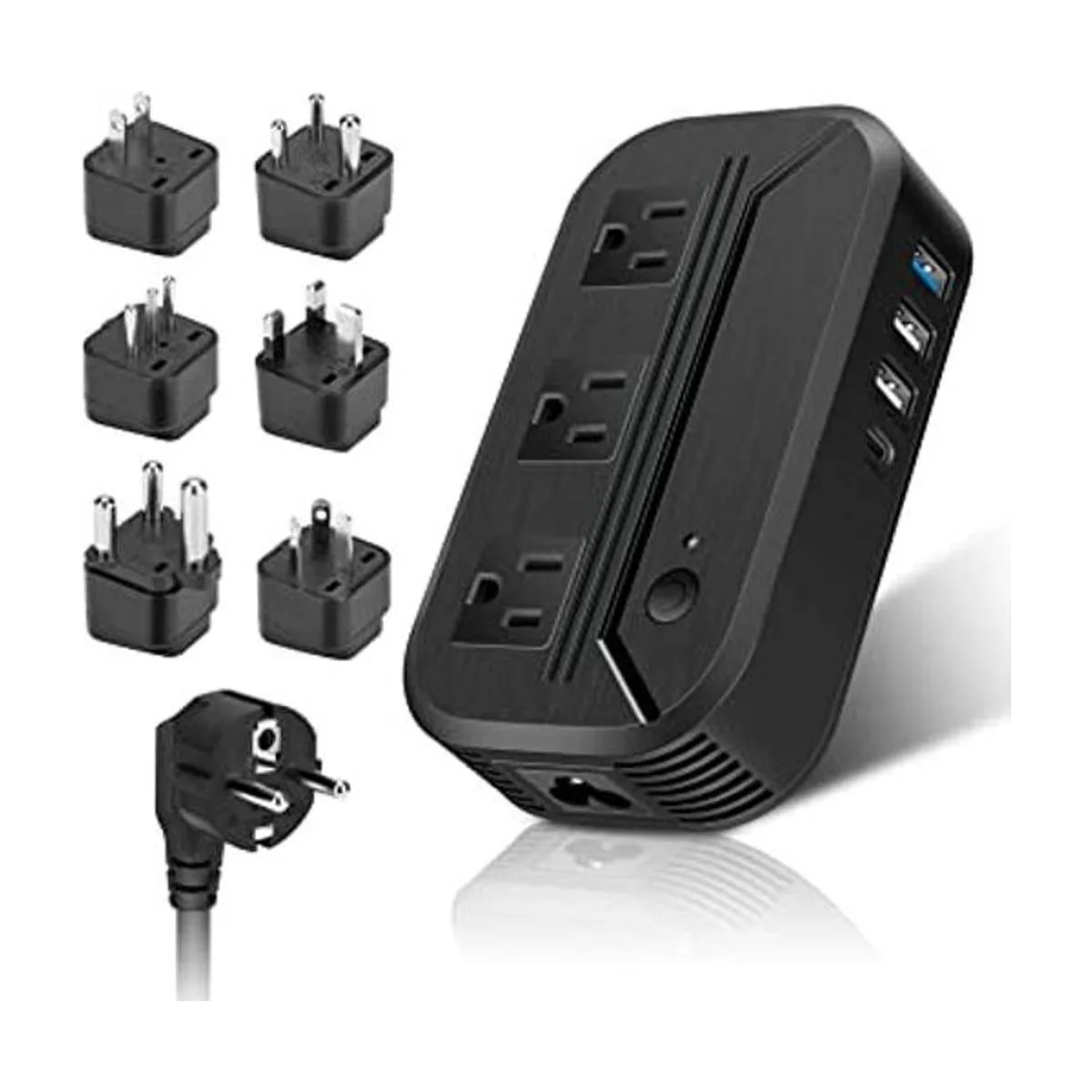 Convertidor de voltaje mundial Nuestro convertidor de corriente tiene como objetivo bajar 220/240 V a 110/120 V, con 1 cable de enchufe de la UE y 7 adaptadores de enchufe UK/AU/US/IT/India/Sudáfrica que cubren más de 200 países, puedes usar o cargar tus dispositivos electrónicos no duales para viajes en el extranjero por todo el mundo, no te preocupes por el voltaje de los dispositivos. y problemas de carga mientras estás fuera de Estados Unidos y viajas en cualquier país que tenga una clasificación de 220 V para ambos 50/60 Hz