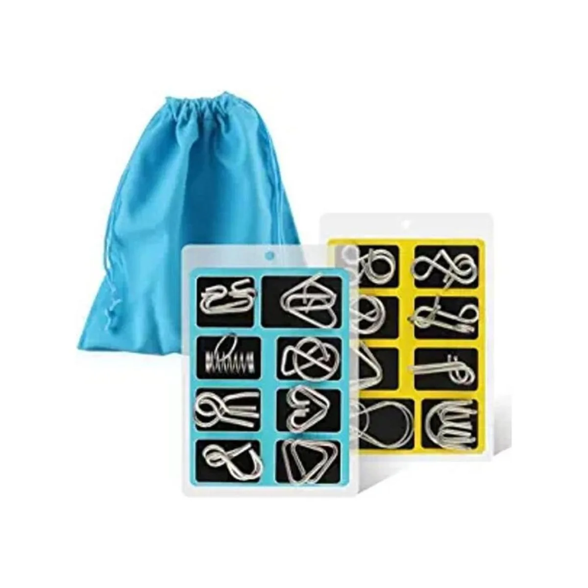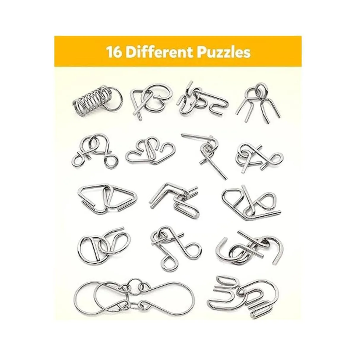 Coogam Juego de 16 rompecabezas de alambre de metal con bolsa, prueba de coeficiente intelectual desenredante, enlace de hierro, juego de entrelazado, anillo chino, juguete mágico para recuerdos de fiesta, desafío de niños y adultos