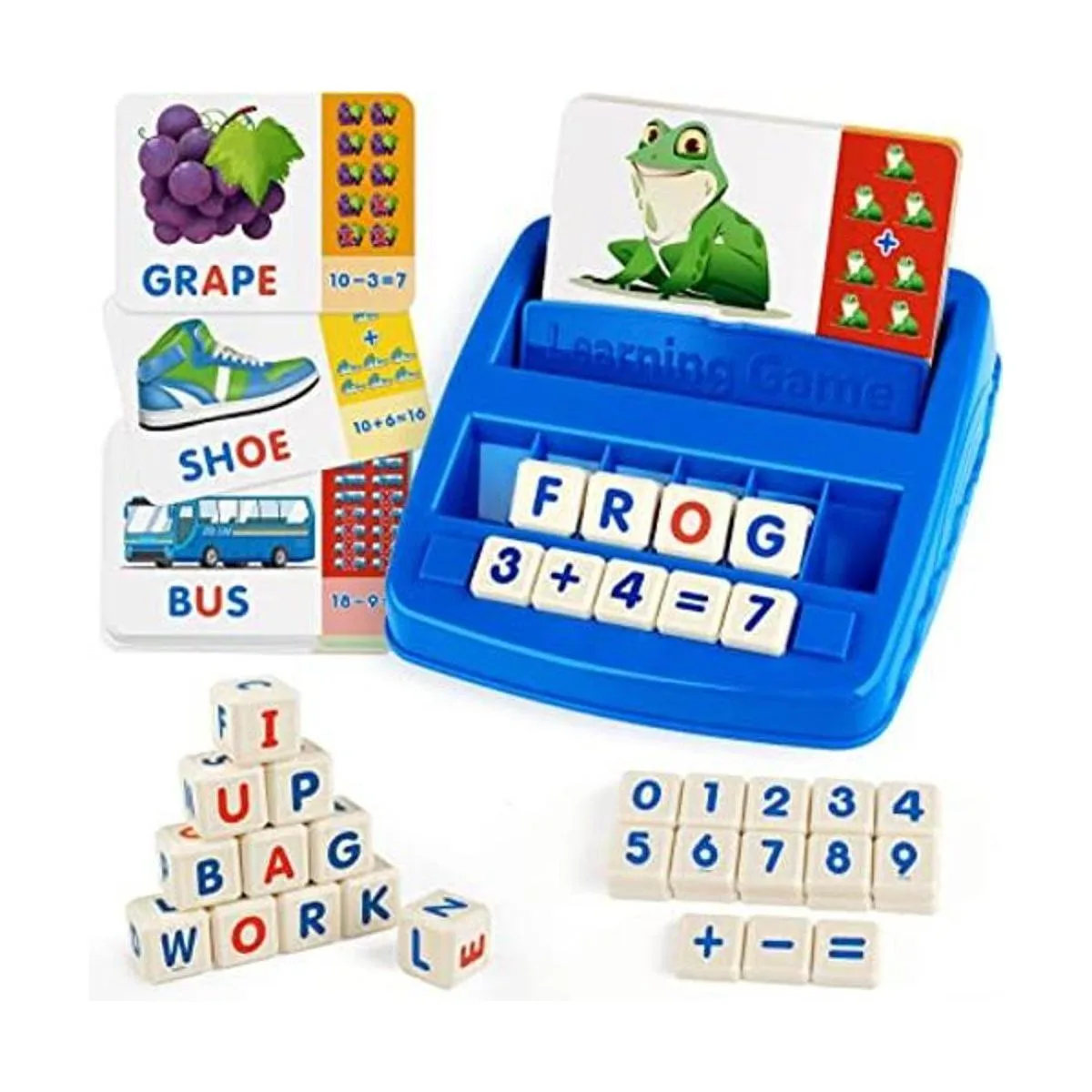 Juego de ortografía de letras: obtienes 52 tarjetas de actividad con prácticas matemáticas y juegos de ortografía, 11 dados de letras, 20 azulejos de números con 3 símbolos matemáticos, 1 bandeja de cartas y una bolsa de cordón del paquete económico. Un juego excepcional para que los niños aprendan a deletrear y asociarse con las imágenes.