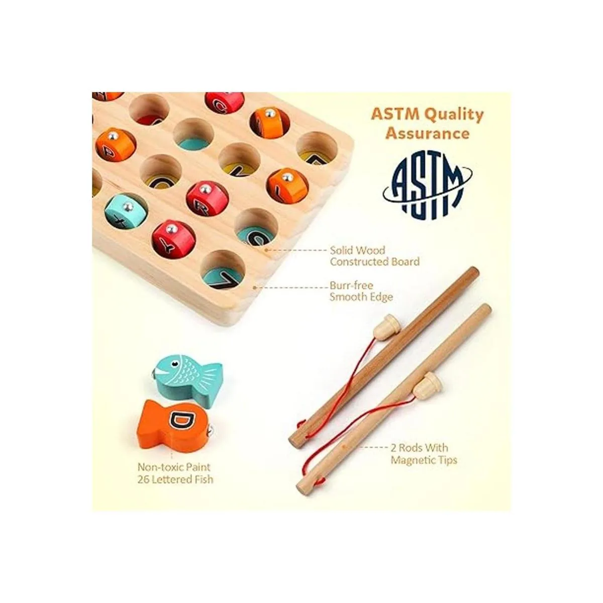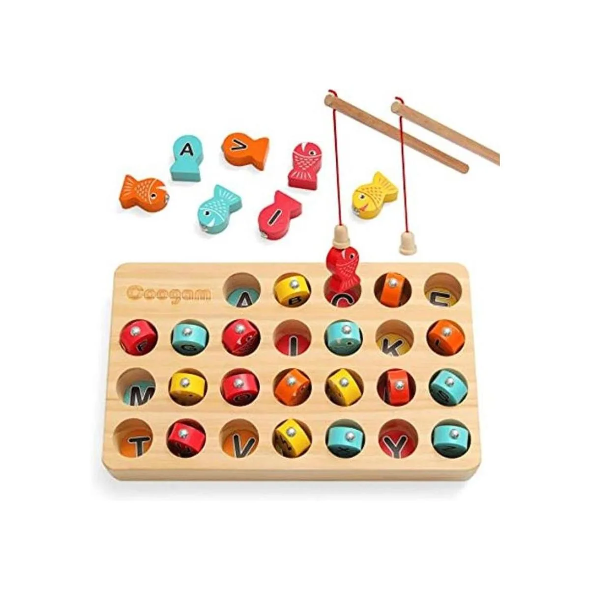 Coogam Juego de pesca de madera magnético, un buen juguete para la habilidad motora, rompecabezas de clasificación de colores del alfabeto ABC, letras Montessori, regalo preescolar para niños de años de edad con 2 postes