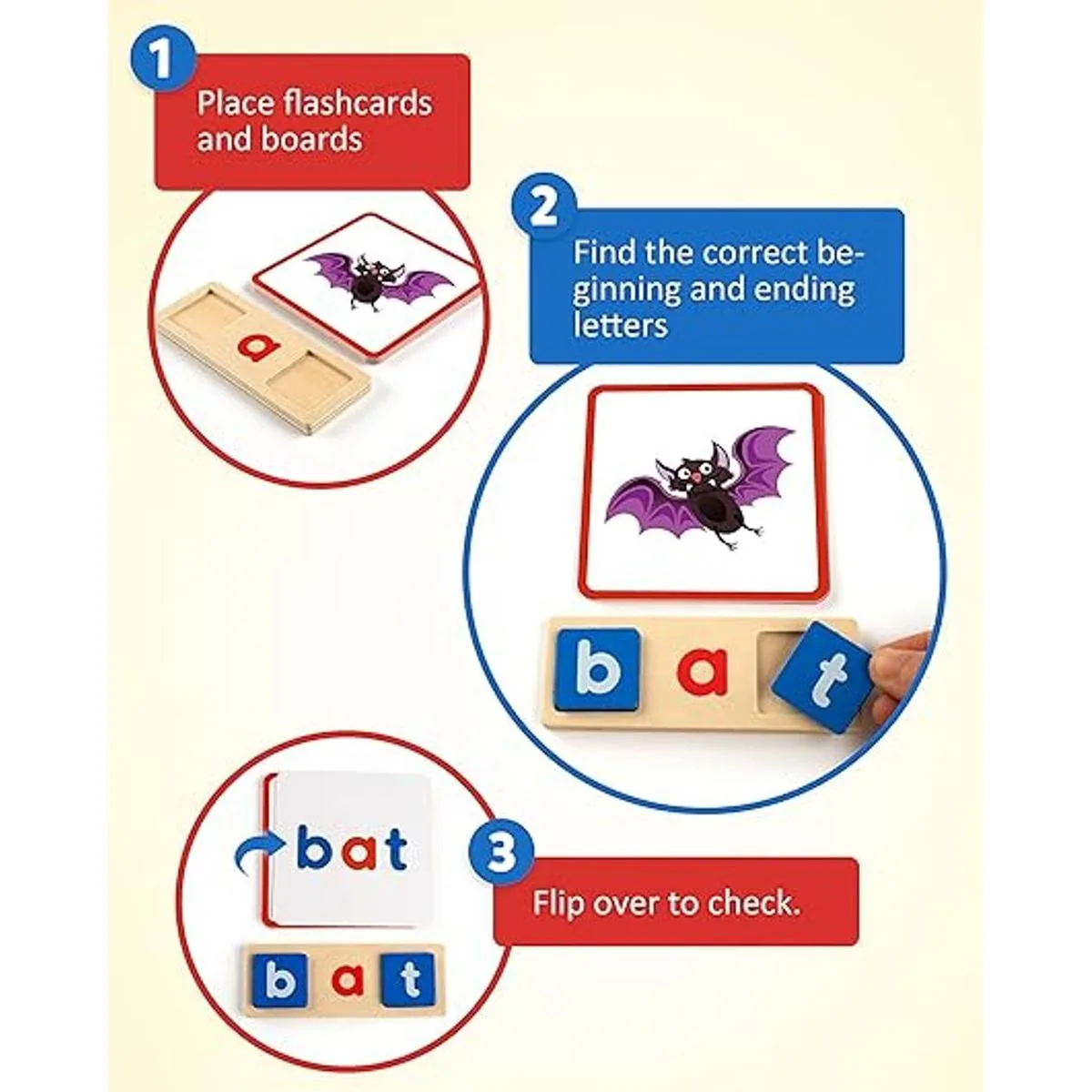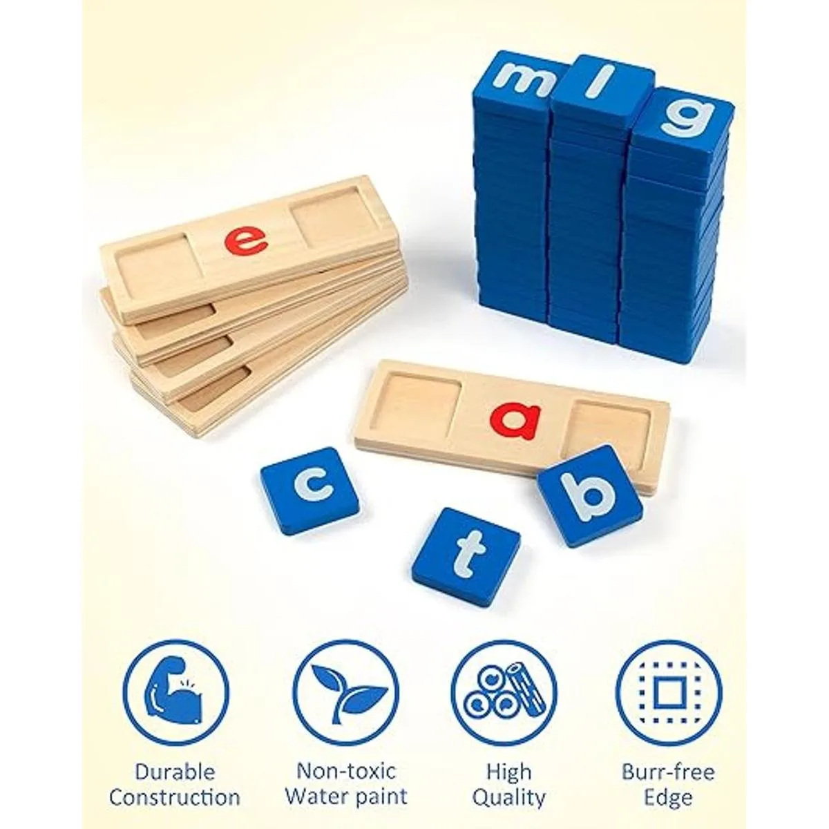 Coogam Letras de lectura de vocales cortas de madera, juegos de ortografía, palabras a la vista, tarjetas del alfabeto, rompecabezas Montessori, juguete educativo regalo para niños de 3, 4, 5 años