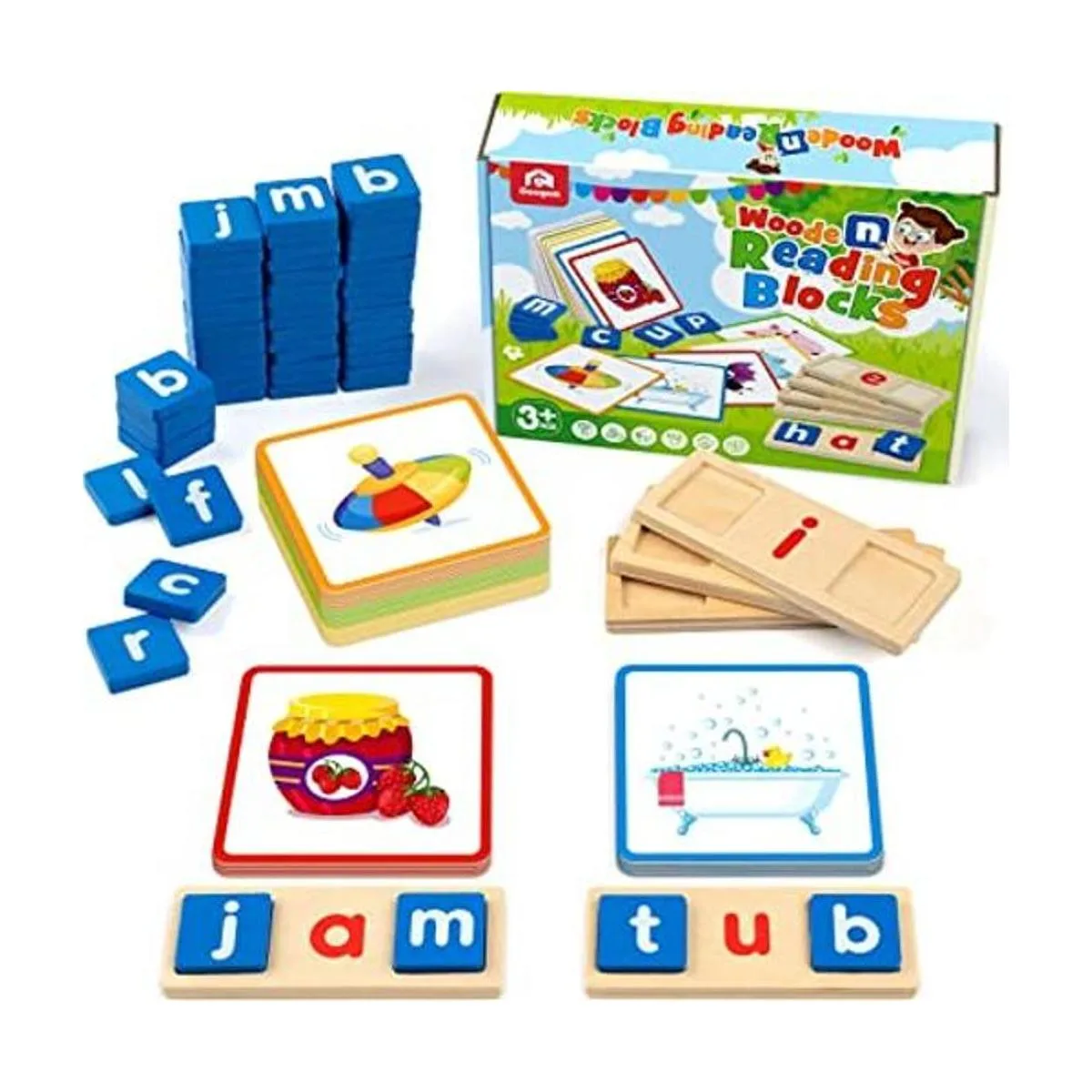 Bloques de lectura de madera: hay 114 piezas que vienen en el juego de juguetes, que contienen 58 piezas de bloques de letras minúsculas de madera, 50 tarjetas de palabras fonéticas CVC con ilustraciones de imagen, 5 tablas de hechizos de madera en tamaño de palma y 1 bolsa portátil de cordón. Más de 48 combinaciones de palabras de 3 letras esperando a que los niños creen y exploren