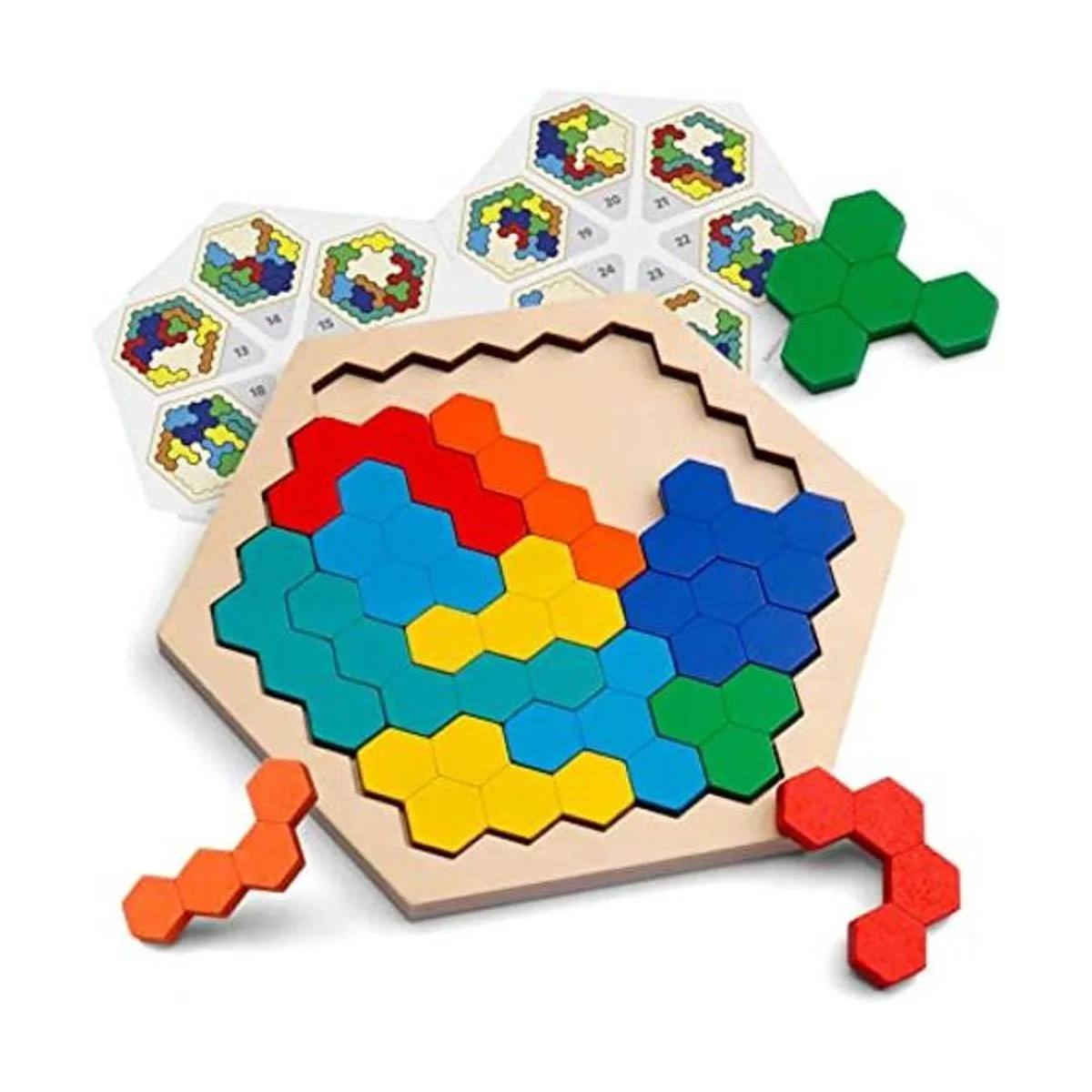 Coogam Rompecabezas hexagonal de madera para niños y adultos, bloque de patrón de forma, tangram, juguete de avance cerebral, lógica, juego de coeficiente intelectual STEM Montessori, regalo educativo para todas las edades