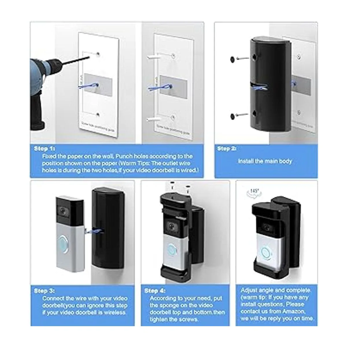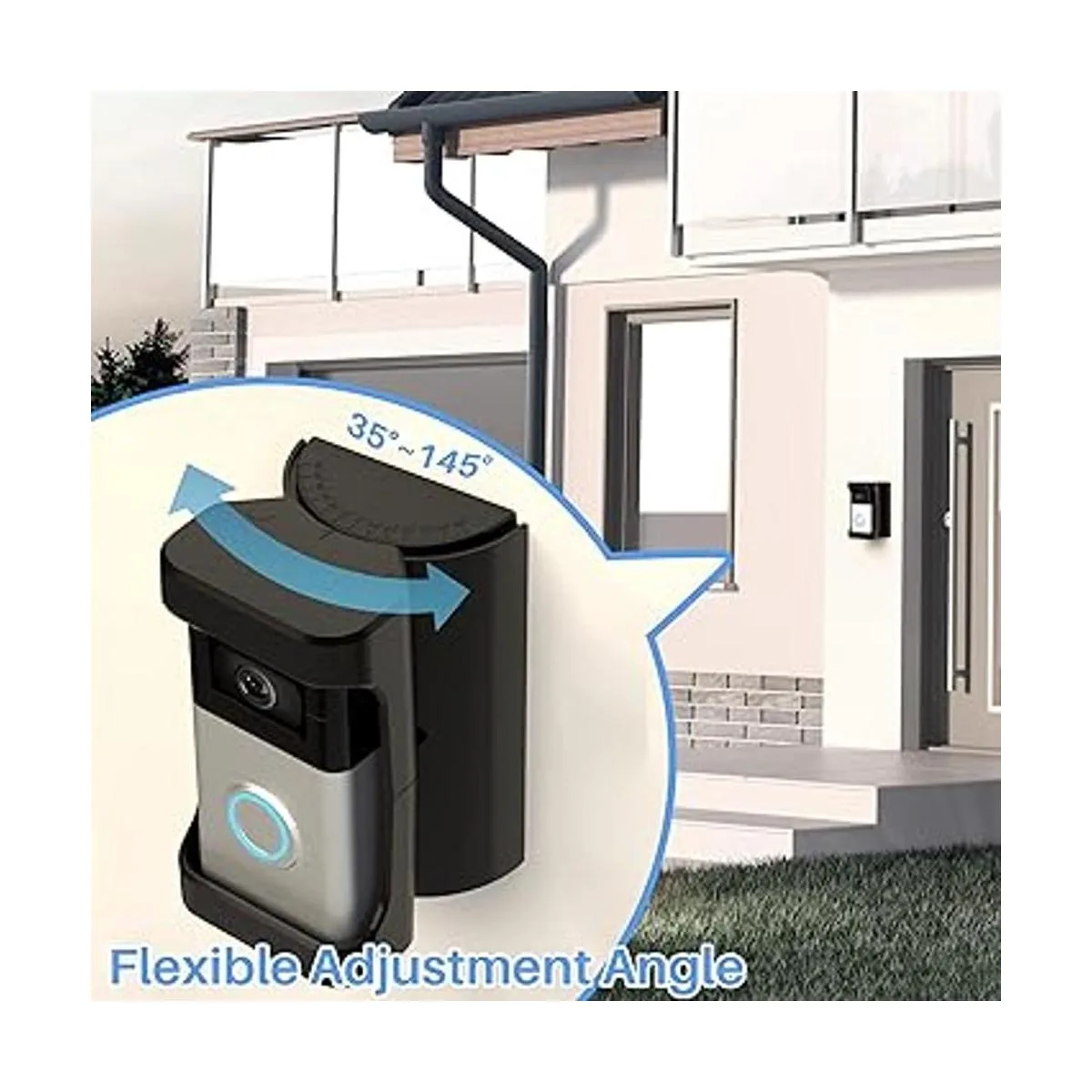 ngulo y escala de ángulo ajustables: la parte superior del soporte de timbre de video tiene escala de ángulo. Puedes ajustar fácilmente el ángulo dentro de 35 a 145 grados.