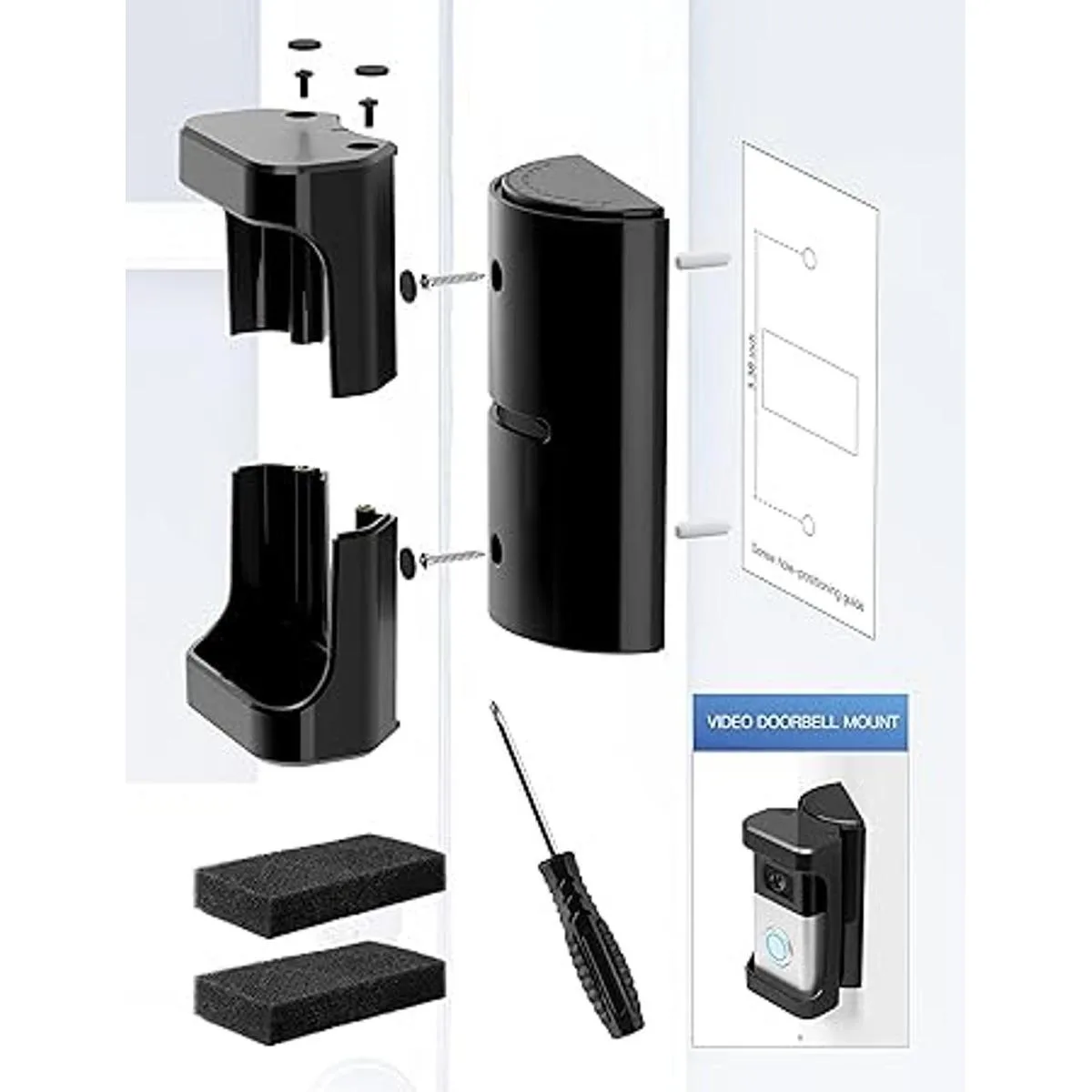 Timbres de video compatibles: el soporte antirrobo COOLWUFAN es adecuado para la mayoría de timbres de video de marca, el tamaño del timbre debe ser inferior a 5.1 pulgadas de alto x 2.8 pulgadas de ancho x 1.3 pulgadas de profundidad el timbre de video no está incluido. Consejo: Mide el tamaño de tu timbre de video antes de realizar el pedido.