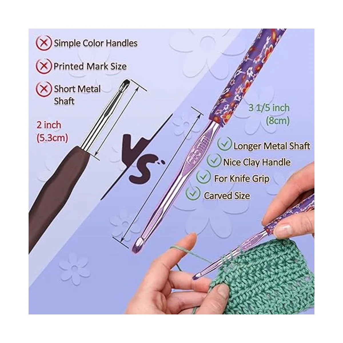 Gancho de aluminio bonito y suave, identifica fácilmente el tamaño: el patrón de agarre de ganchillo adopta hermosos patrones de serie de flores. Nuestro juego de ganchos de ganchillo tiene un gancho suave, que no se engancha en el hilo ni divide el hilo. Hace que el proceso de ganchillo sea más eficiente y cómodo. Agujas de ganchillo multicolor, diferentes colores que combinan con diferentes tamaños de agujas de tejer. Cada gancho está marcado con números y letras, por lo que nunca te confundirás
