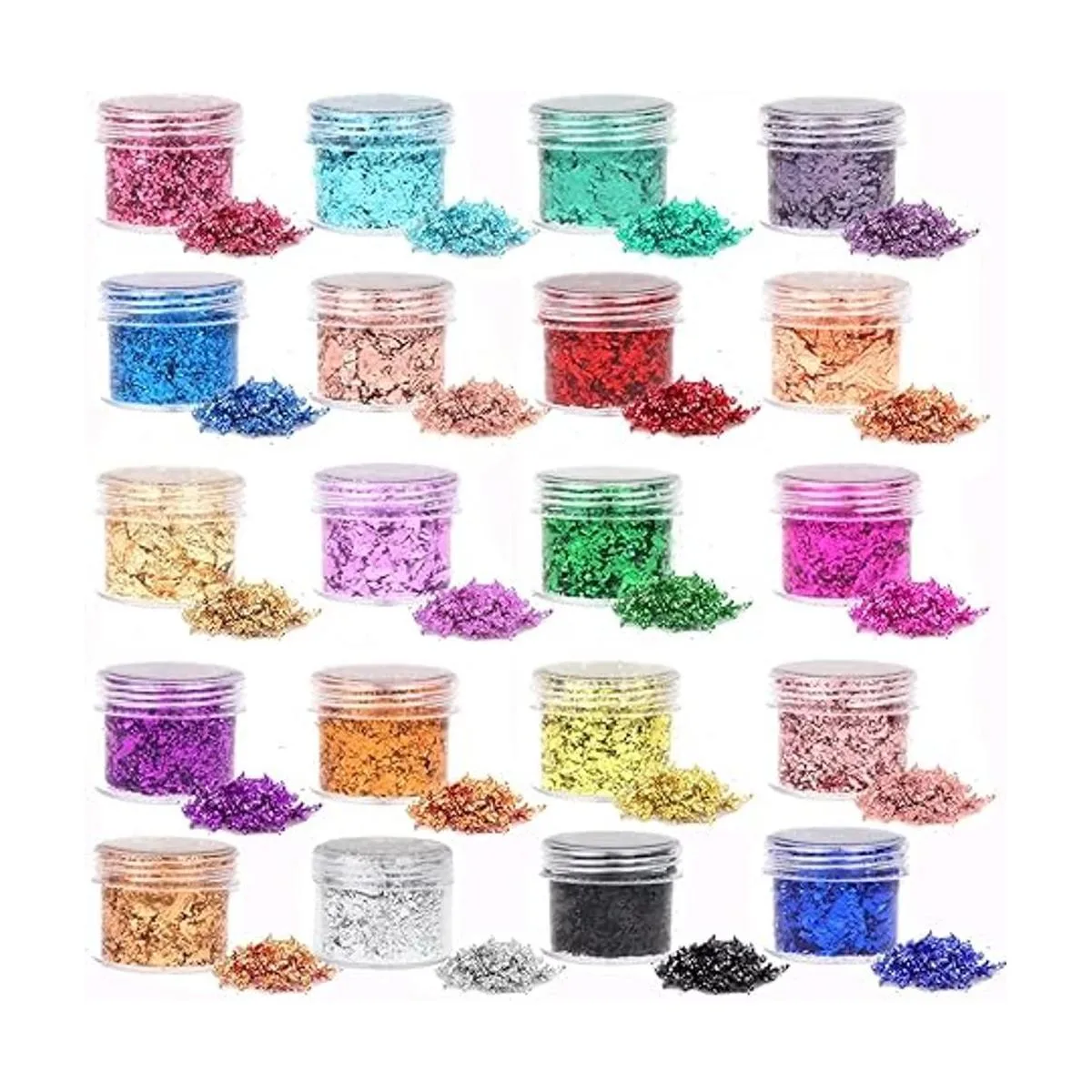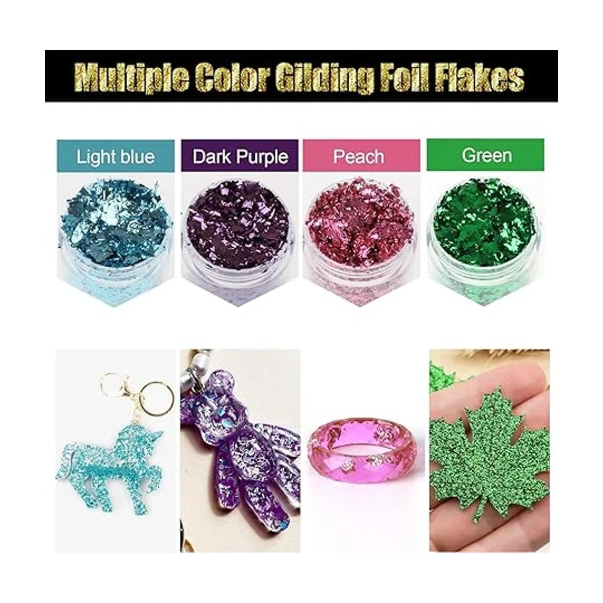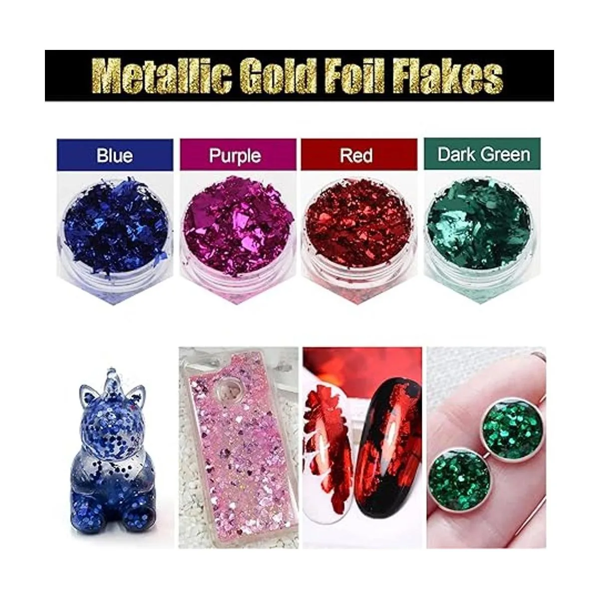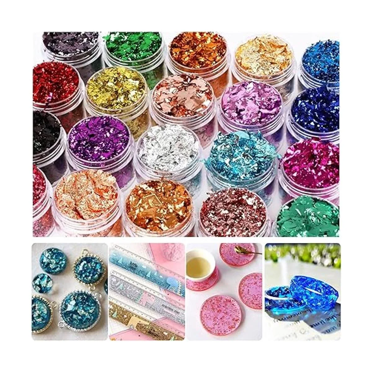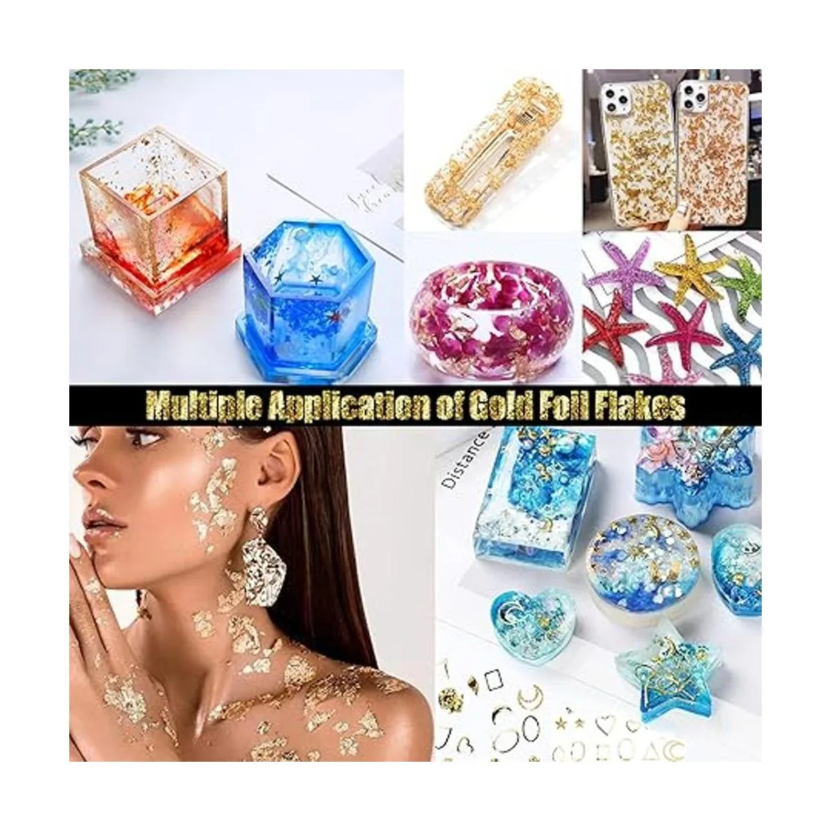 Copos de lámina de amplia aplicación : copos de hoja de oro de imitación multiusos, perfectos para crear manualidades de resina epoxi, joyas de resina, slime con purpurina, tarjetas de felicitación, marcadores, pintura 3D y decoración del hogar. También es ideal como arte de uñas de aluminio.