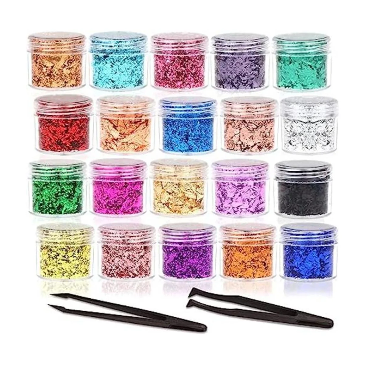 Copos de lámina dorada de varios colores para resina: este juego de copos de lámina dorada contiene 20 colores diferentes negro, verde, rojo rosa, plata, oro, cobre, rojo, azul, morado, azul brillante, azul brillante, amarillo, oro rosa, morado oscuro, azul oscuro, burdeos, oro rosa, verde oscuro, etc. Con 2 pinzas incluidas, proporcionando una sección completa para tus proyectos de bricolaje.