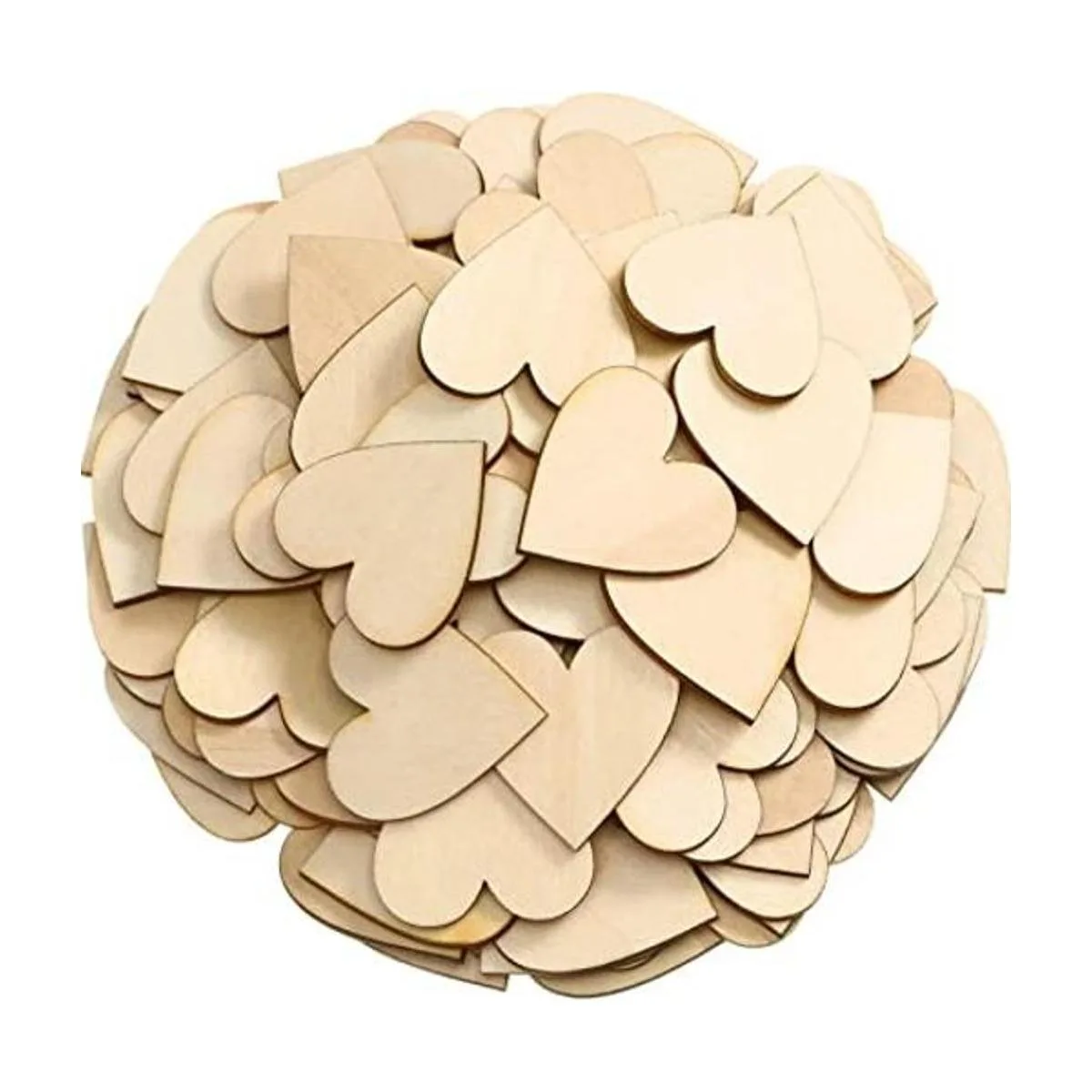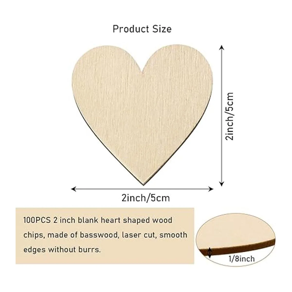 Contenido del paquete: 100 piezas de madera en forma de corazón sin acabar, tamaño del producto 2 pulgadas, grosor 1/8 pulgadas.