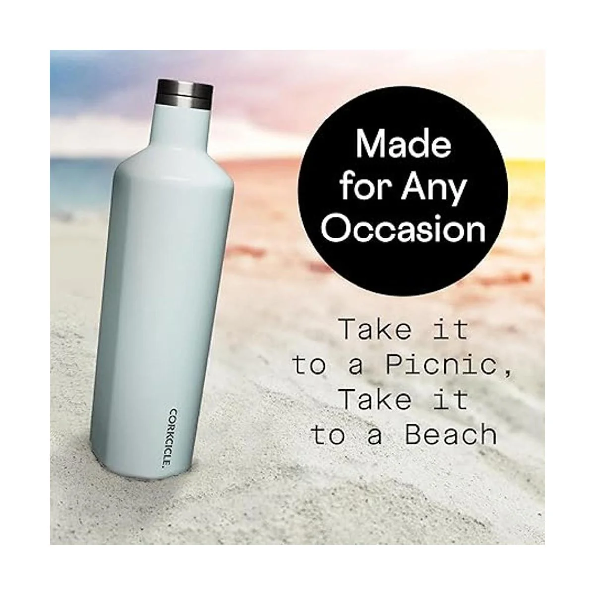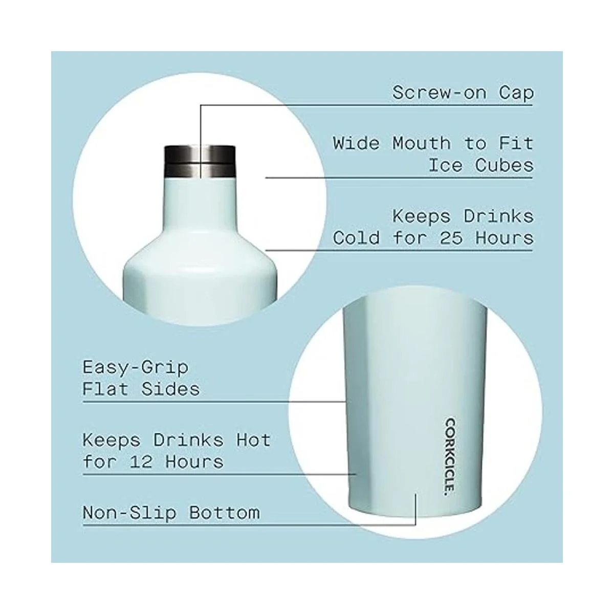 Corkcicle Botella de agua de viaje con aislamiento de cantina, acero inoxidable con triple aislamiento, lados planos de fácil agarre y tapa de atornillado, mantiene las bebidas frías durante 25 horas o calientes durante 12 horas, 25 onzas, color azul polvo