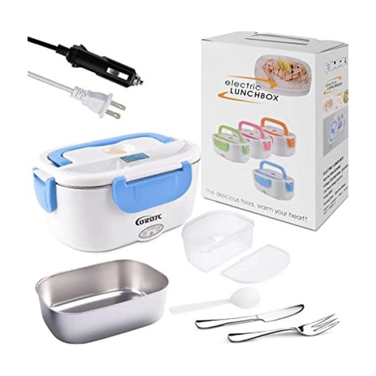 COROTC Fiambrera eléctrica, 12 V24 V110 V 3 en 1 a prueba de fugas, lonchera para automóvil, camión, hogar, oficina, calentador de alimentos portátil de 1.5 L con bandeja de acero inoxidable 304, tenedor, cuchara y compartimento de 0.45 L