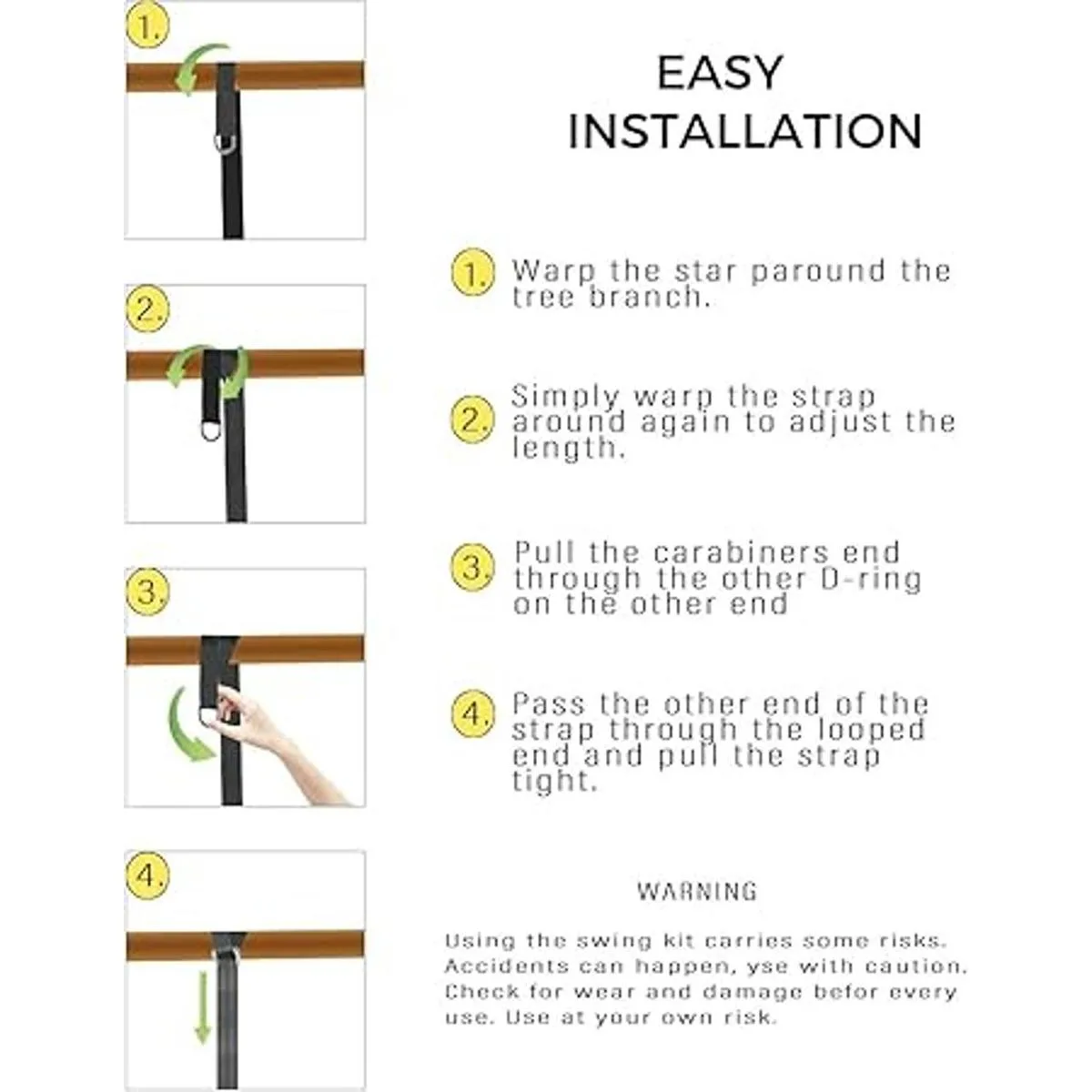 Material de seguridad duradero: la seguridad siempre debe ser la máxima prioridad. Las correas de columpio utilizan materiales de grado industrial para crear las correas de columpio más duraderas y seguras del mercado. Cada correa tiene costuras adicionales en los bucles de tela de anillo de metal para proporcionar una fijación resistente y fiable sin romperse en las costuras.