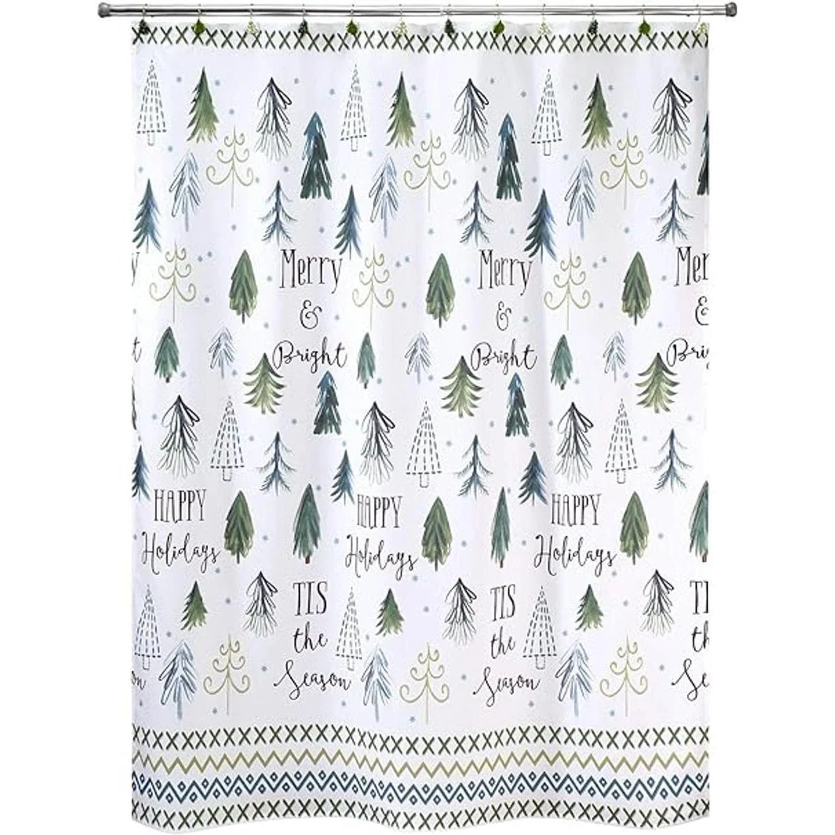 Cortina de ducha festiva: la cortina de ducha de árboles de Navidad cuenta con diferentes estilos de árbol perenne en diferentes tonos sobre un fondo blanquecino. Borde superior e inferior impreso en un diseño artístico de puntada.