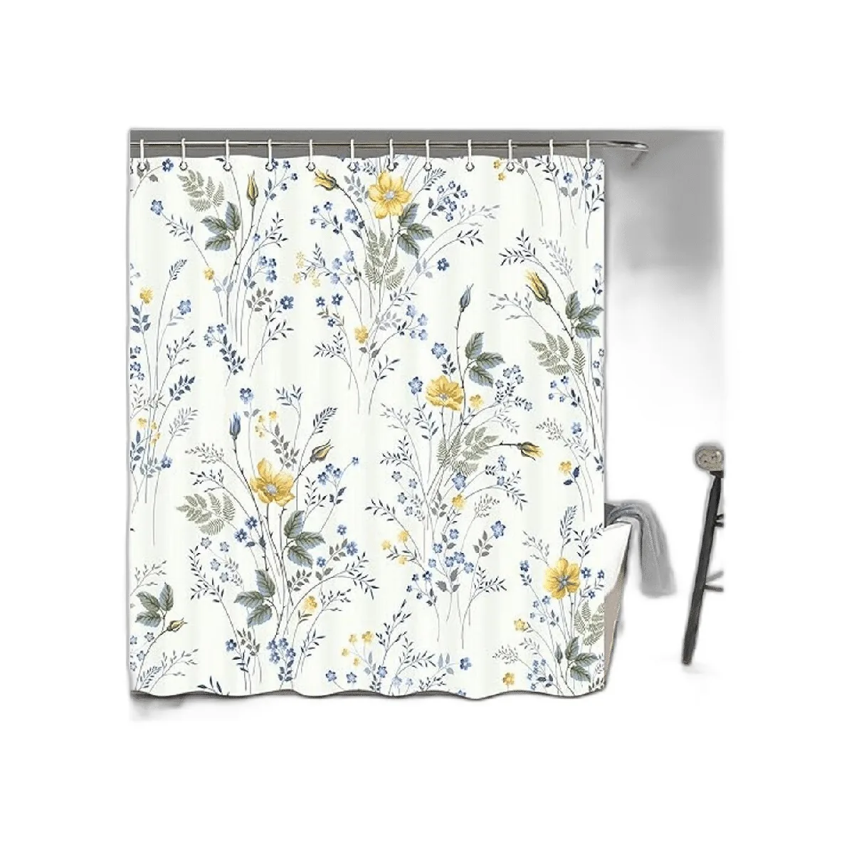 Cortina de ducha floral, cortina de ducha floral de acuarela azul y amarillo, accesorios de bañera de hojas verdes para niñas, mujeres, baño, hojas verdes florales, juego de cortinas de baño botánicas con ganchos, 70 x 70 pulgadas
