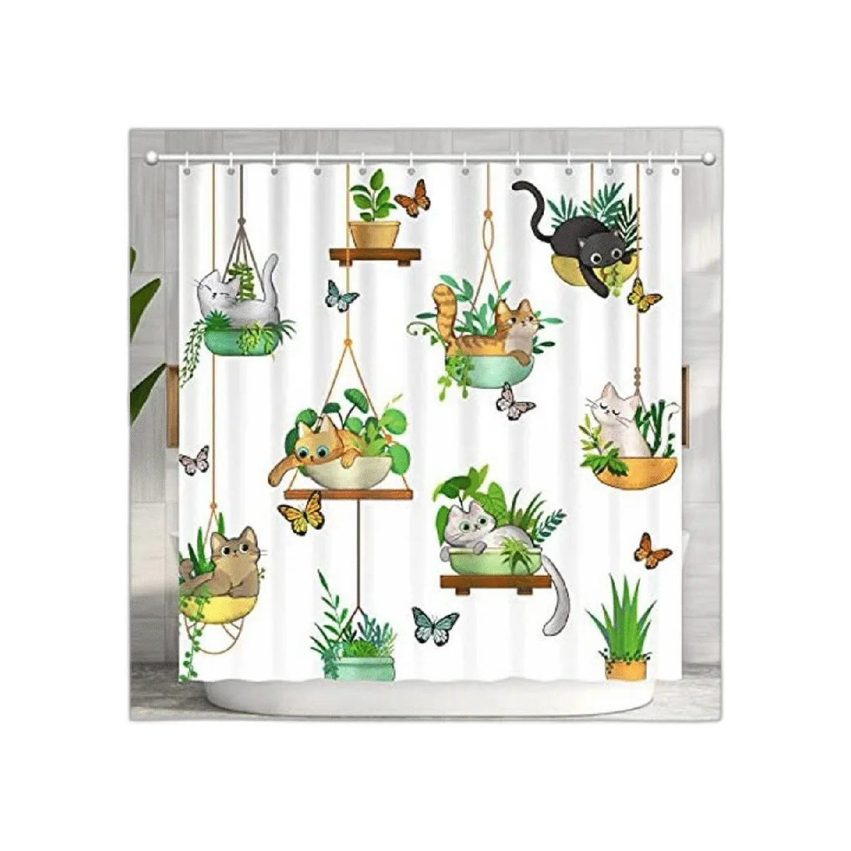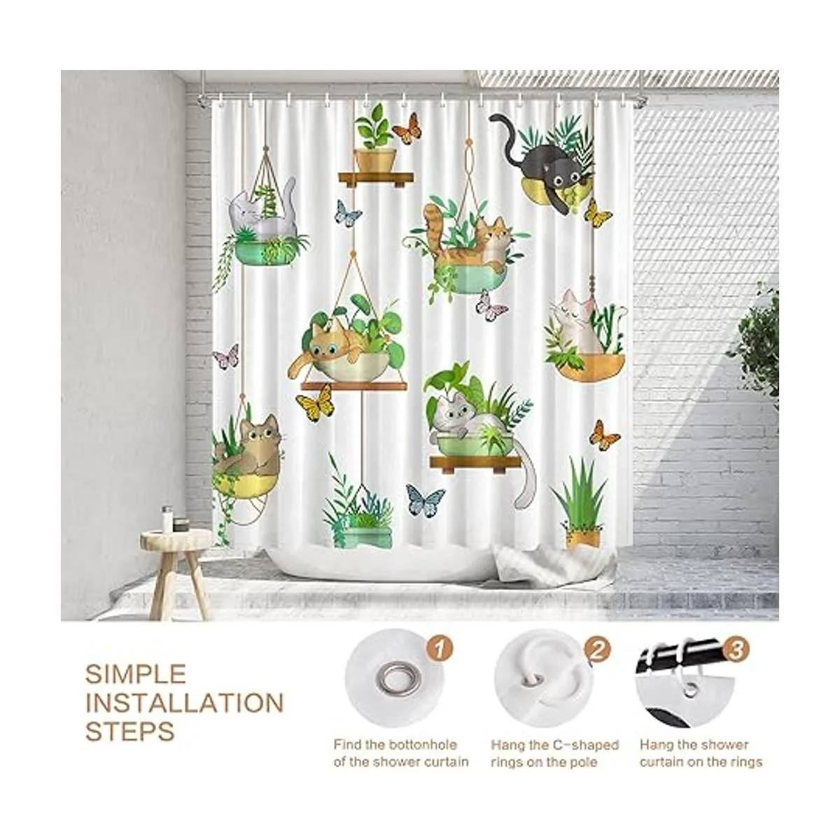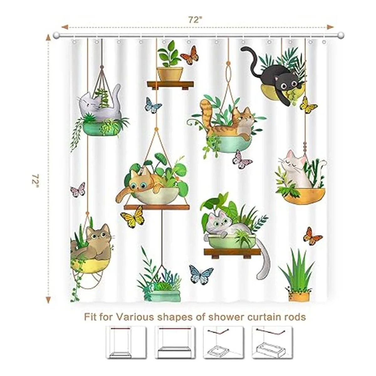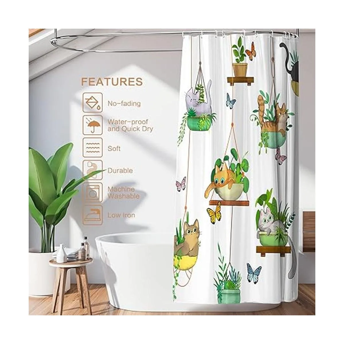 Cortina de ducha para gatos con plantas colgantes en maceta, cortina de ducha para baño con 12 ganchos, tela de poliéster impermeable, lavable a máquina, cortinas de baño para niños