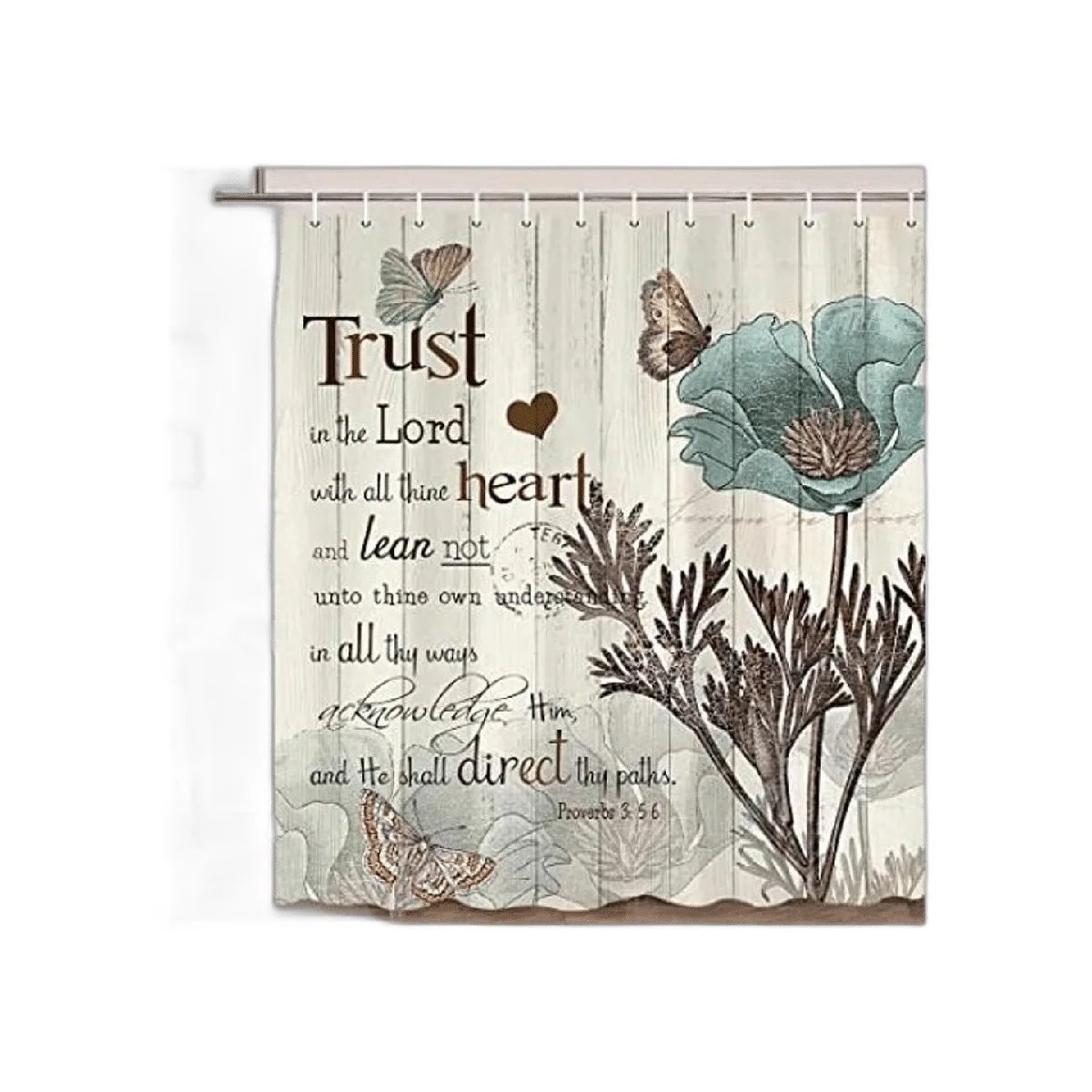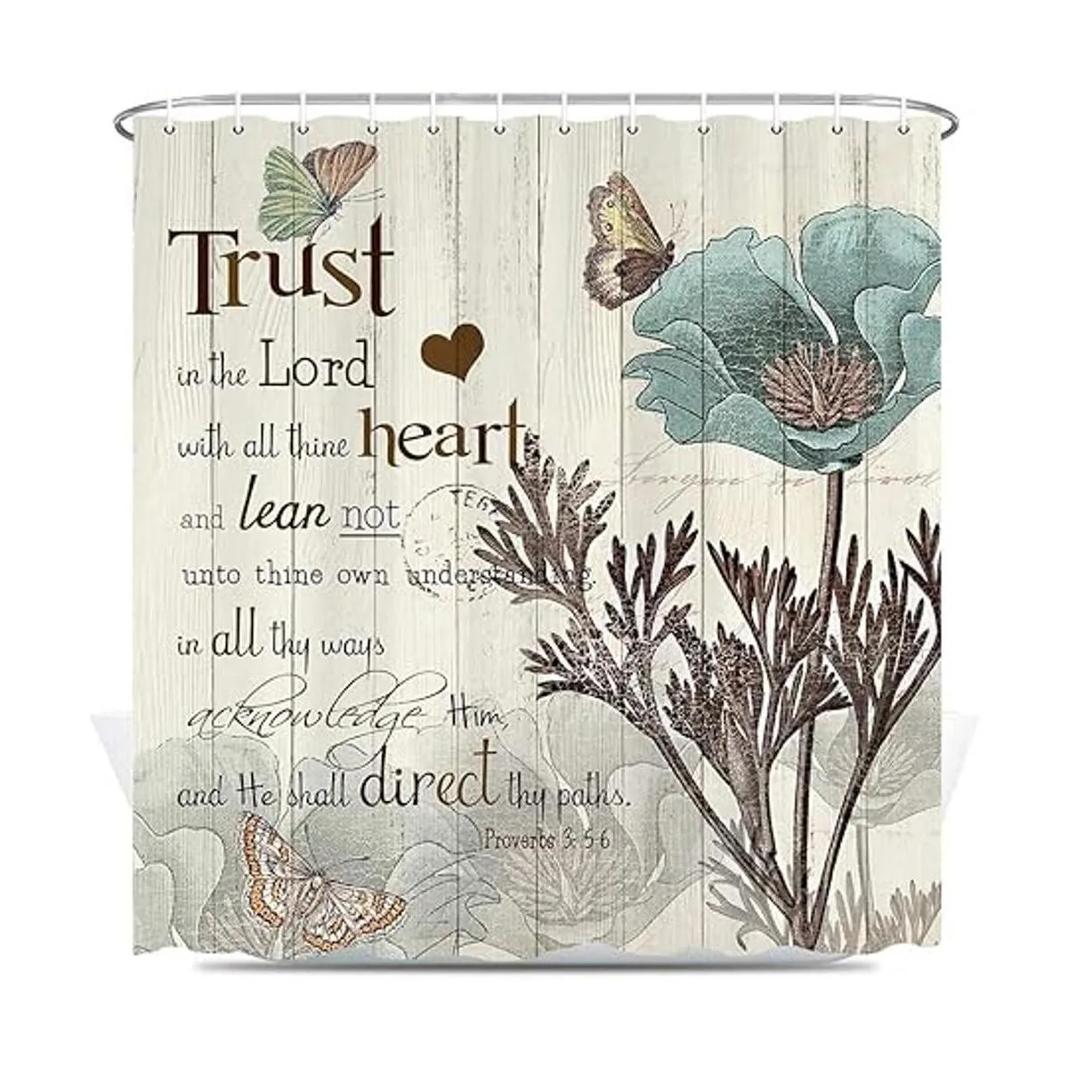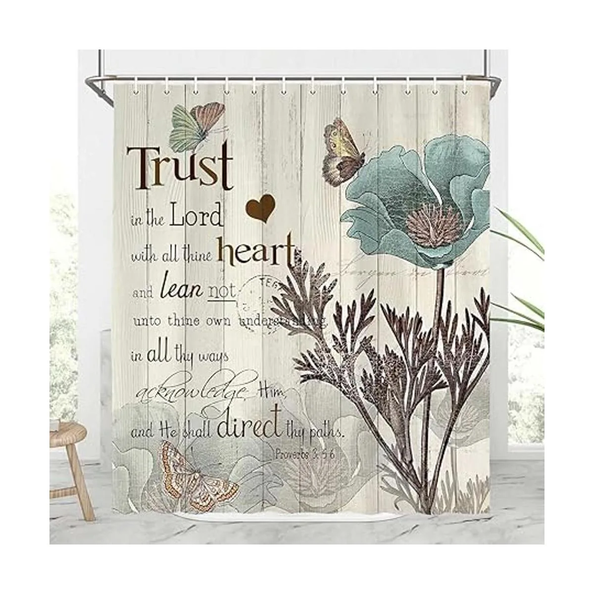Cortina de ducha rústica elegante con tulipán de color verde azulado, versículo bíblico, juego de cortinas de ducha de tela inspiradora, poliéster vintage, accesorio de baño floral con gancho de 60 x 70 pulgadas, color beige