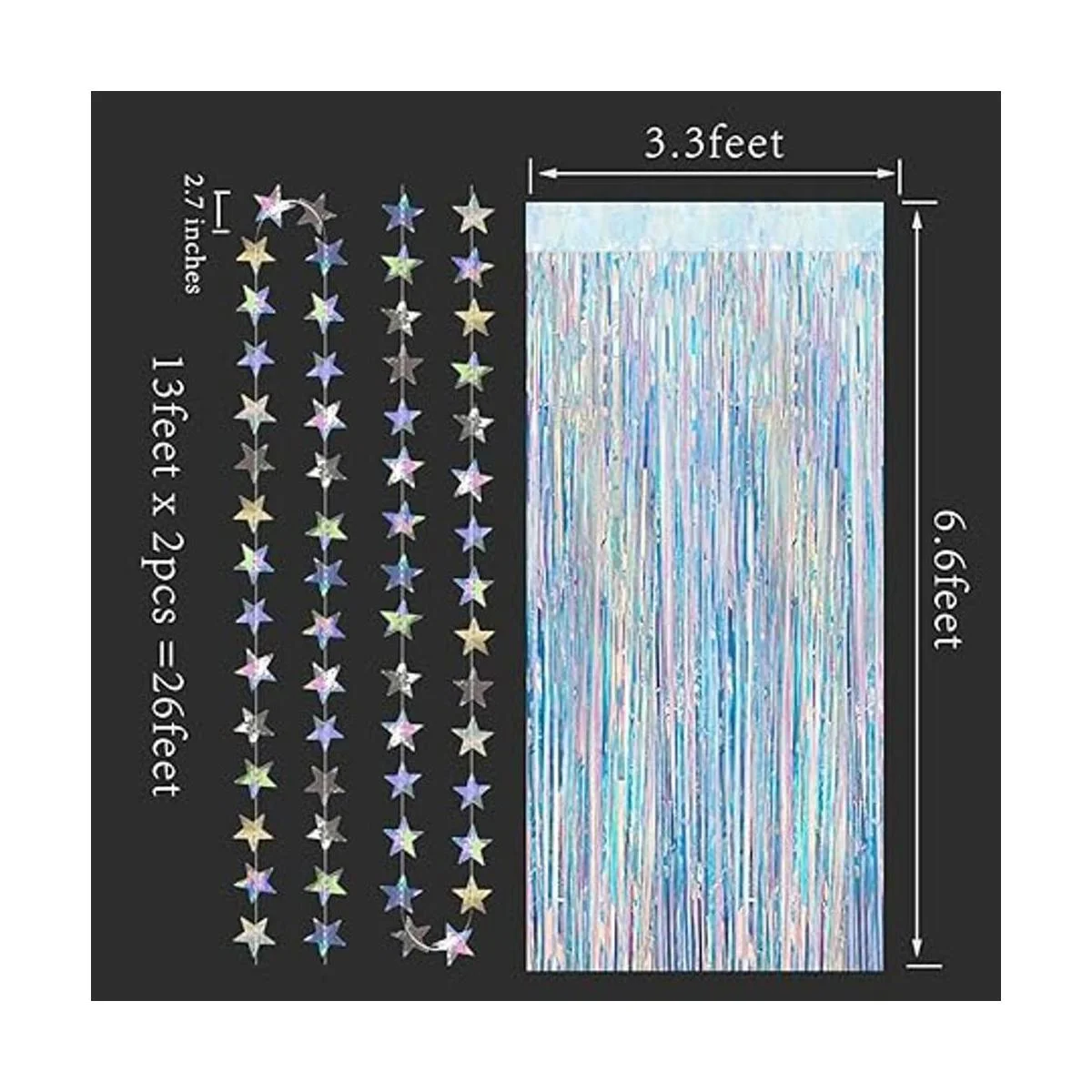 El paquete incluye: 1 cortina de flecos holográfica intermitente de 3.3 x 6.6 pies y 2 cuerdas de guirnaldas de estrellas brillantes, cada una de 13 pies de largo. Cada estrella de papel mide aproximadamente 2.7 pulgadas.