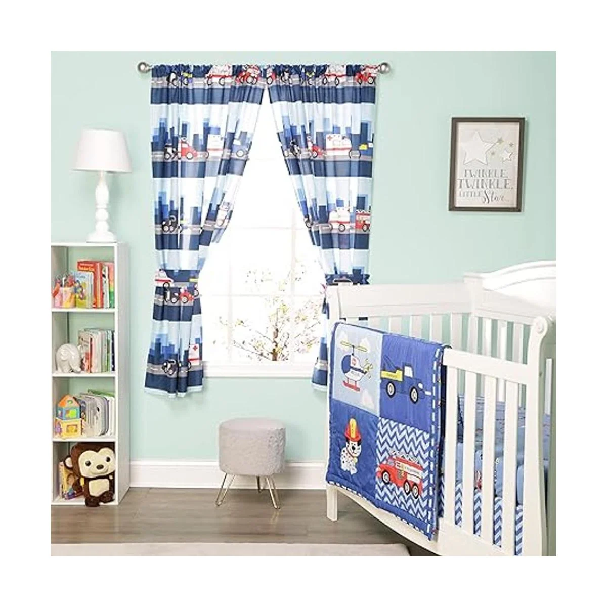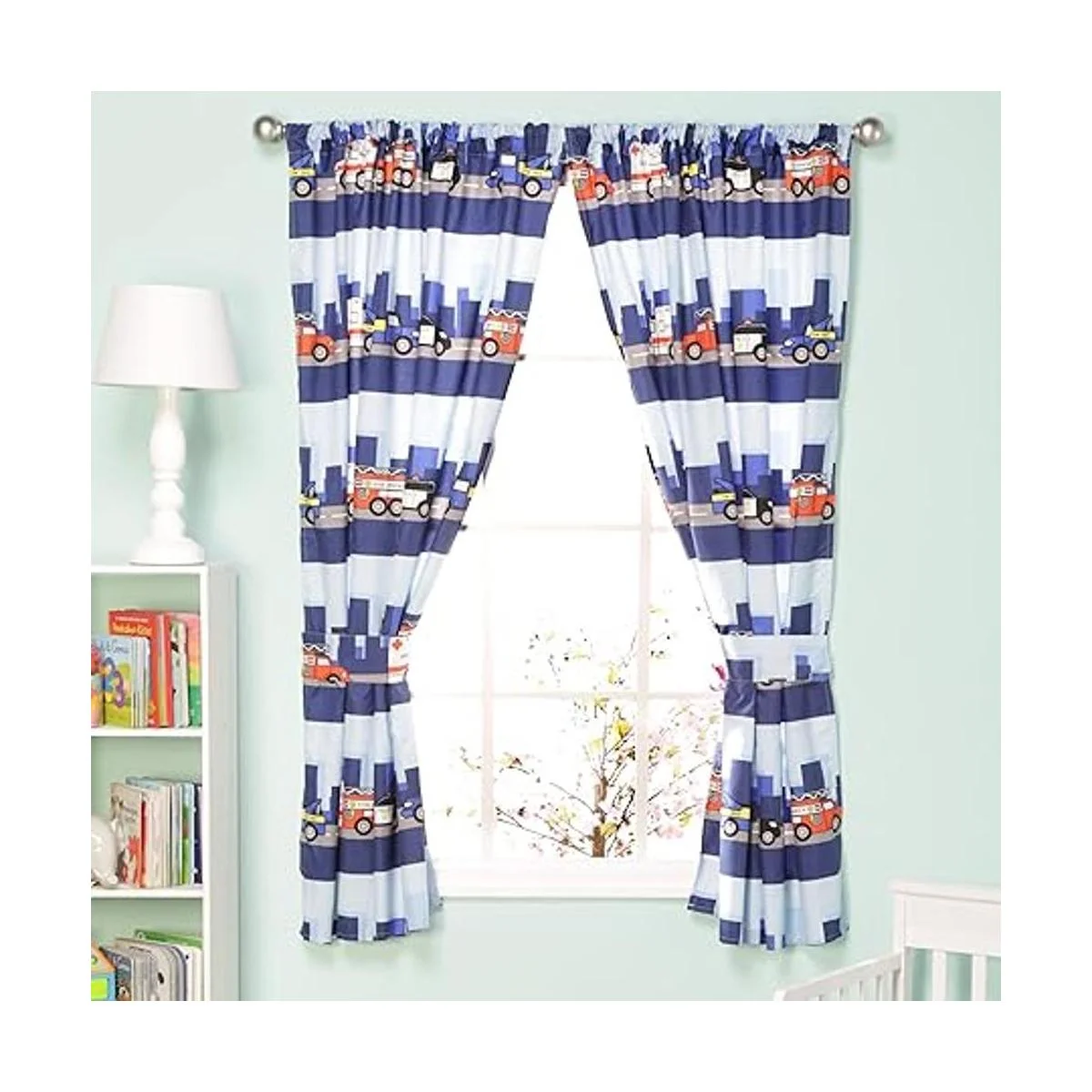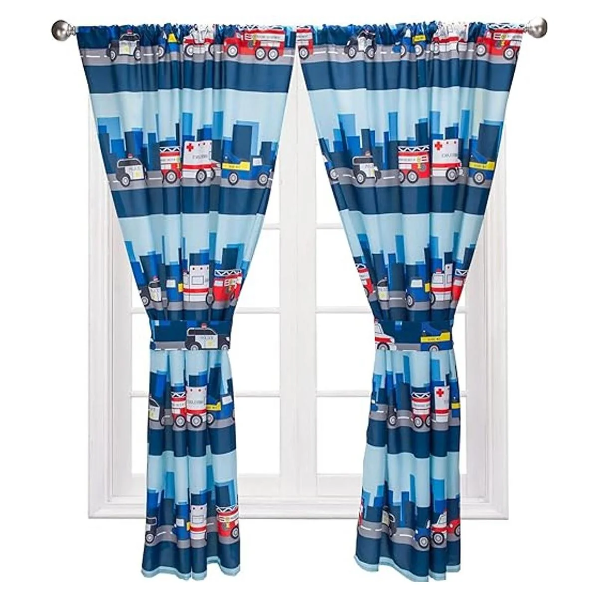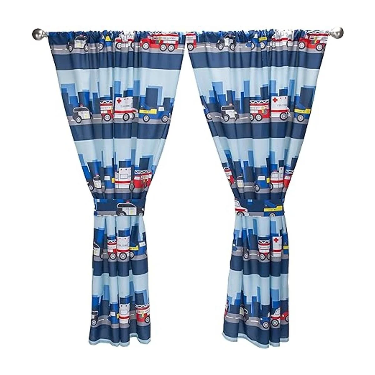 Cortinas para niños para decoración de dormitorio con temática de bomberos y rescate de policía con camiones y coches; 4 cortinas de primeros auxilios para niños con 2 paneles de 82 x 63 pulgadas, tamaño total y 2 alzapañas; cortinas para aula y guardería