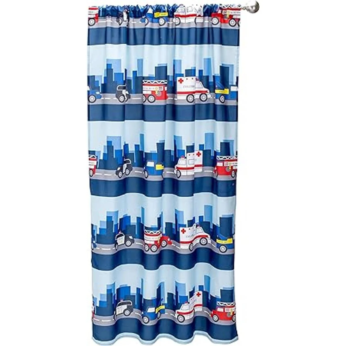 Decoración de dormitorio de niño de rescate y patrulla: fomenta el amor de tu hijo por los héroes de primera respuesta En colores azul oscuro y claro, este par de cortinas cuenta con imágenes grandes y coloridas de dibujos animados de íconos de héroes, como ambulancias, camiones de remolque y cruceros de policía