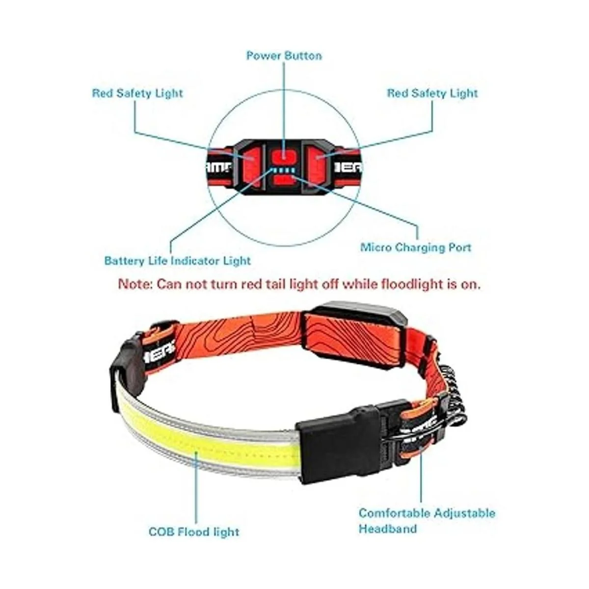 Luz exterior generalizada con luz trasera roja: para mayor seguridad, la luz roja trasera de la cabeza aparecerá sincrónicamente para corredores de advertencia, bicicletas o vehículos mientras la luz de inundación delantera está encendida. Para un diseño de seguridad, no puedes apagar la luz roja por separado.