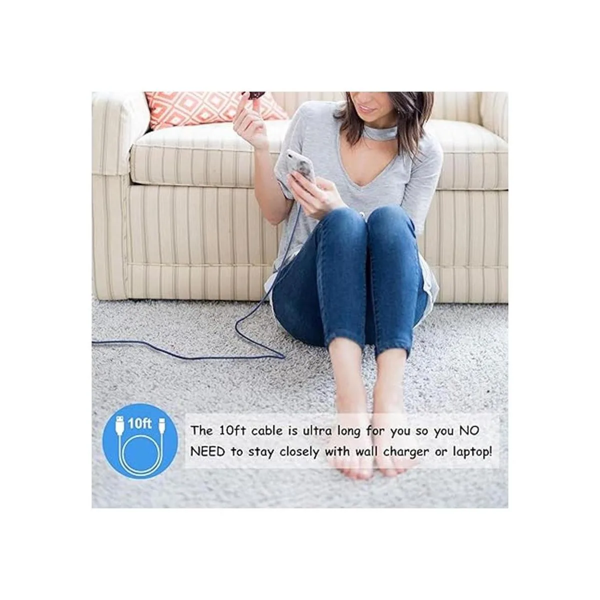 Cable trenzado extra largo de 10 pies : Estos cables USB C están cubiertos con fibra de nailon trenzada colorida, lo que añade durabilidad adicional y no más enredos. Pueden soportar más de 10000 pruebas de flexión. La longitud de 10 pies es lo suficientemente larga para que puedas moverte libremente mientras estás sentado o tumbado en el sofá o la cama, incluso en el asiento trasero de tu coche. No hay necesidad de permanecer cerca con el cargador de pared o la computadora portátil.