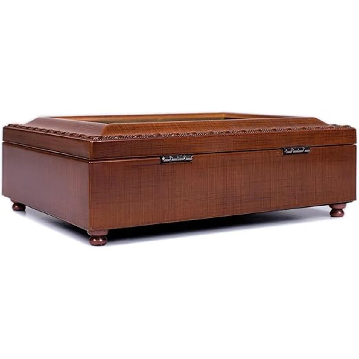 Interior forrado de terciopelo negro que amortigua tus preciados tesoros y recuerdos. Las patas decorativas para moños están acolchadas para proteger la superficie de la mesa y las superficies del estante