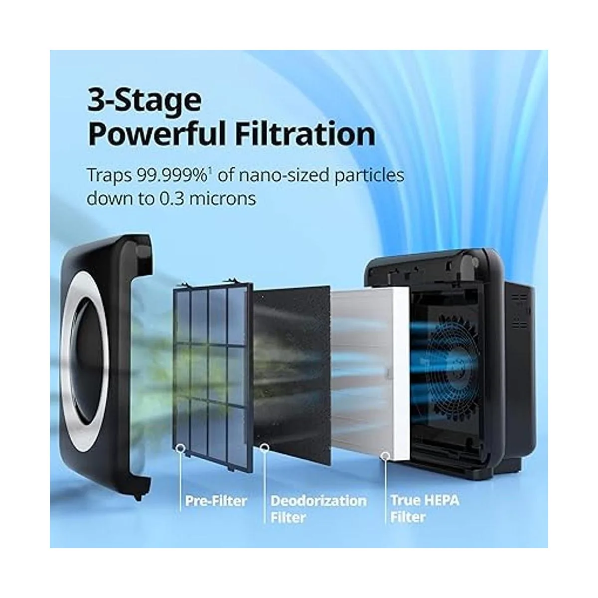 Sistema de filtración de 4 etapas prefiltro, filtro de desodorización, filtro HEPA verdadero, iones vitales captura y reduce hasta el 99.97 de las partículas de 0.3 micras en el aire, incluyendo polen, contaminantes y otros alérgenos. También reduce los compuestos orgánicos volátiles y reduce el olor.