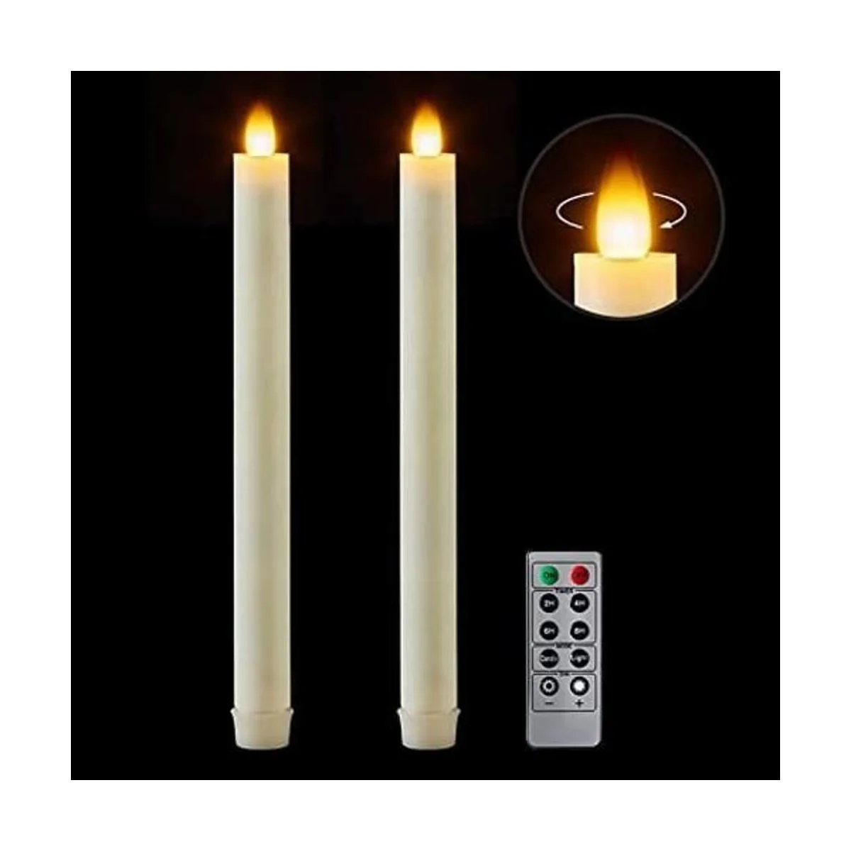 El paquete incluye: 2 velas cónicas sin llama 2 x 9 pulgadas, un control remoto de 10 teclas con temporizador y un manual de usuario idioma español no garantizado.