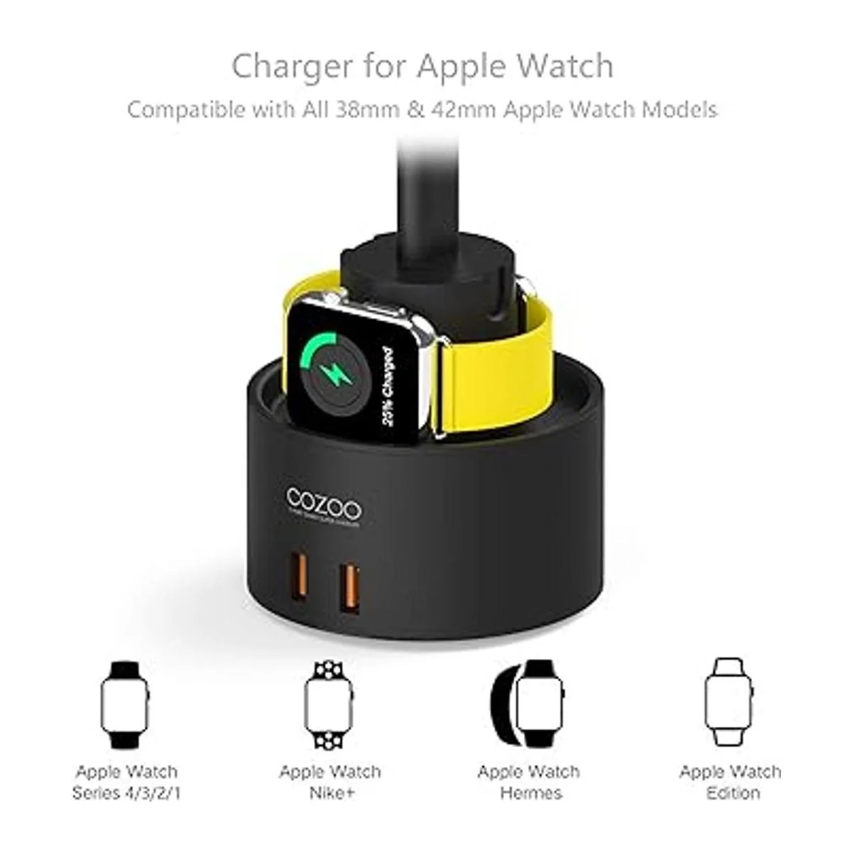 Soporte para iWatch: compatible con iWatch Series 4 / Series 3 / Series 2 / Series 1 / Nike/Hermes / Edition, funciona tanto para 1.496 in como 1.654 in. Con corriente combinada de 6 A, el cargador carga hasta 5 dispositivos móviles simultáneamente, satisfaciendo las necesidades de carga de un hogar.