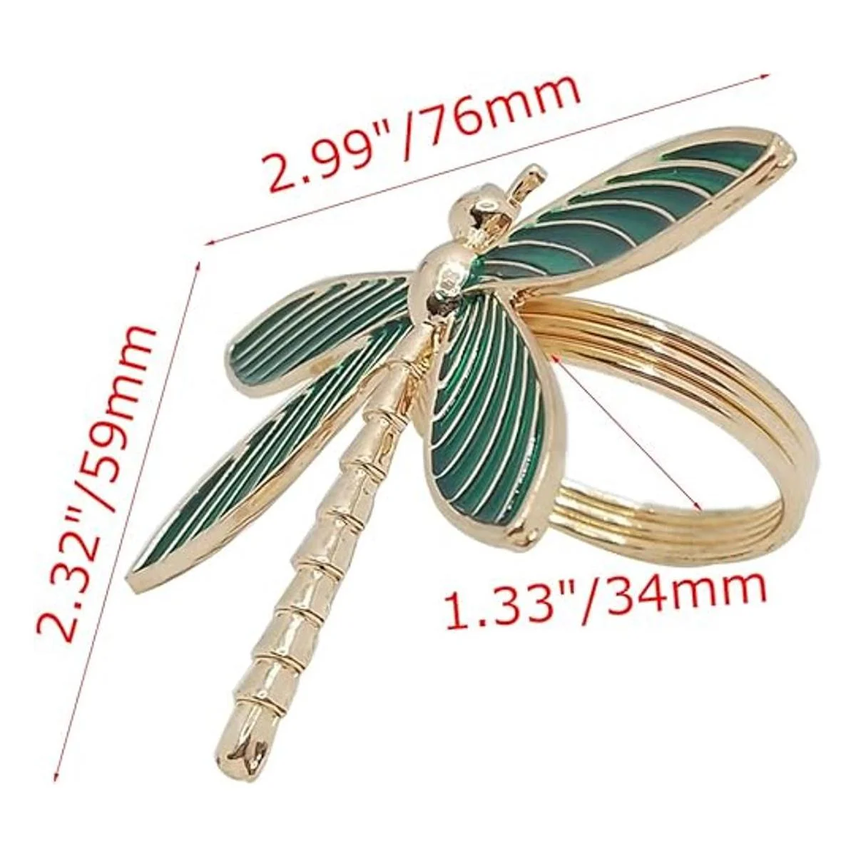 Tamaño: el tamaño desde la cabeza hasta la parte superior de la libélula es de 2.323 in, las dos alas son de 2.992 in de ancho, y el diámetro del anillo es de 1.339 in.