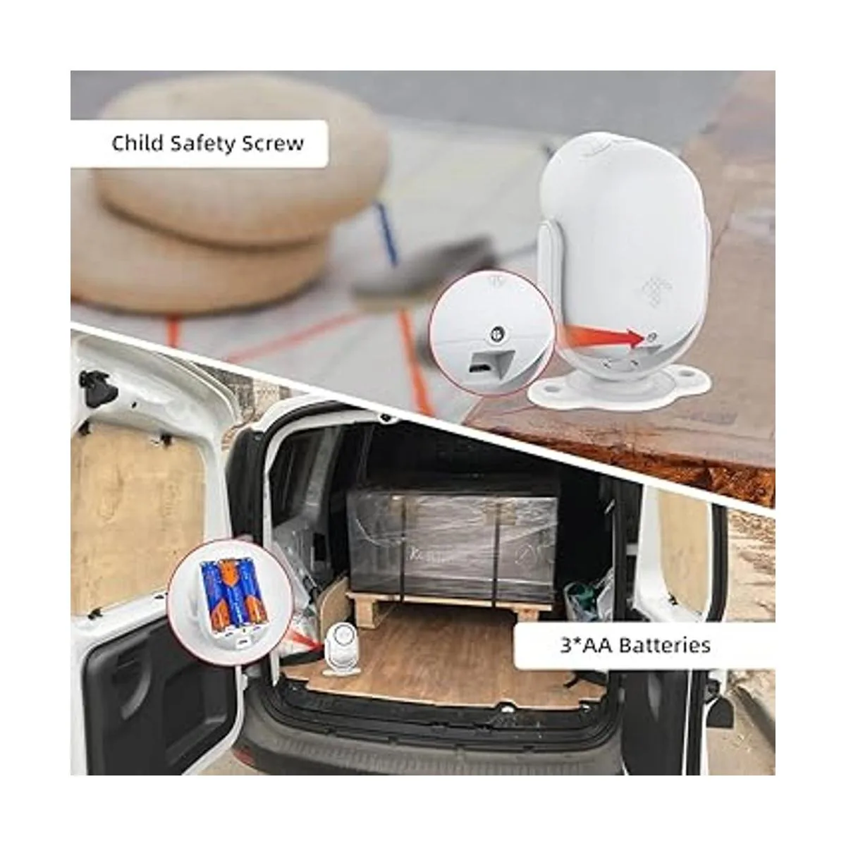 2 opciones de alerta y 2 modos de fuente de alimentación: hay dos tipos de ajustes de alerta: anillo de alarma/anillo de puerta. Dos modos de fuente de alimentación: Los sensores de movimiento se pueden suministrar energía con 3 pilas AA incluidas o micro USB no incluido, solo para suministrar energía, no para cargar.