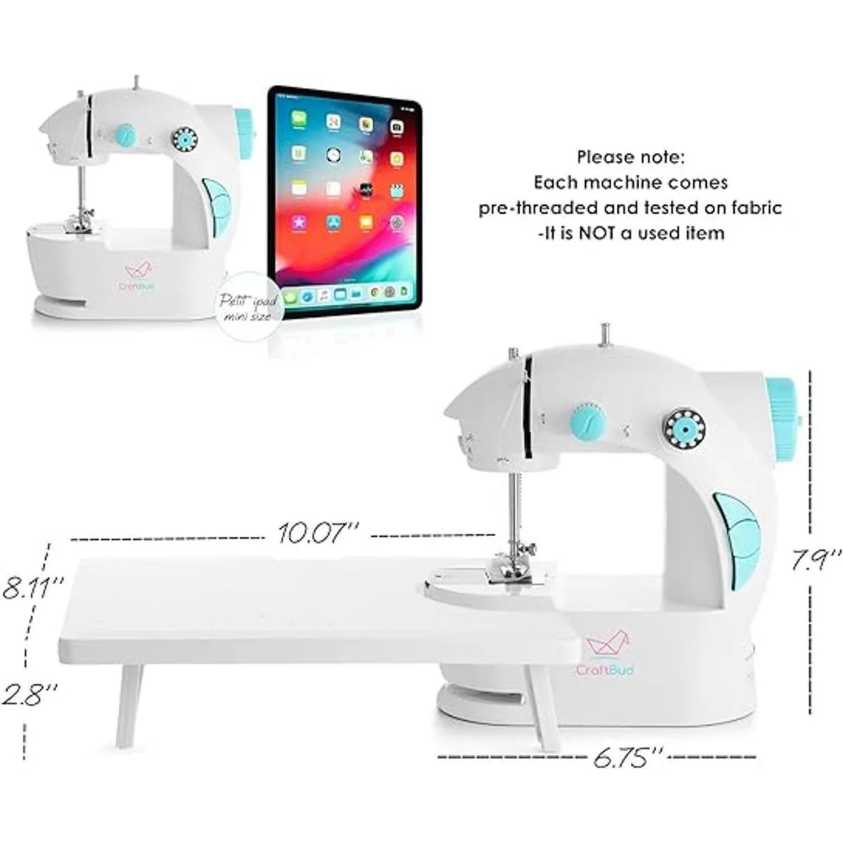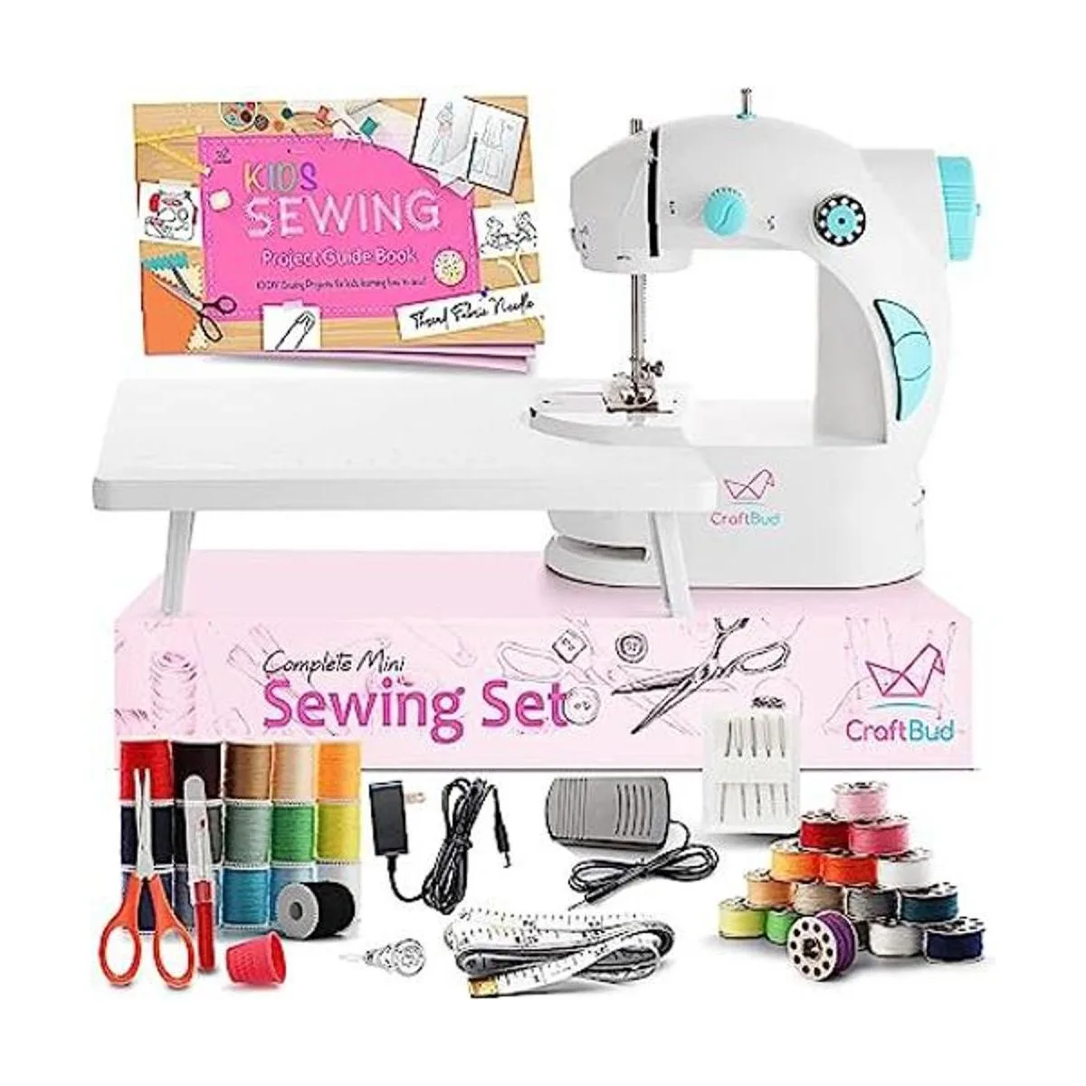 CraftBud Mini máquina de coser para principiantes con kit de coser, 48 piezas de máquina de coser portátil de doble velocidad, kit de máquina de coser pequeña de viaje, máquina de coser para niños de 8 a 12 años con libro de coser de bricolaje y más