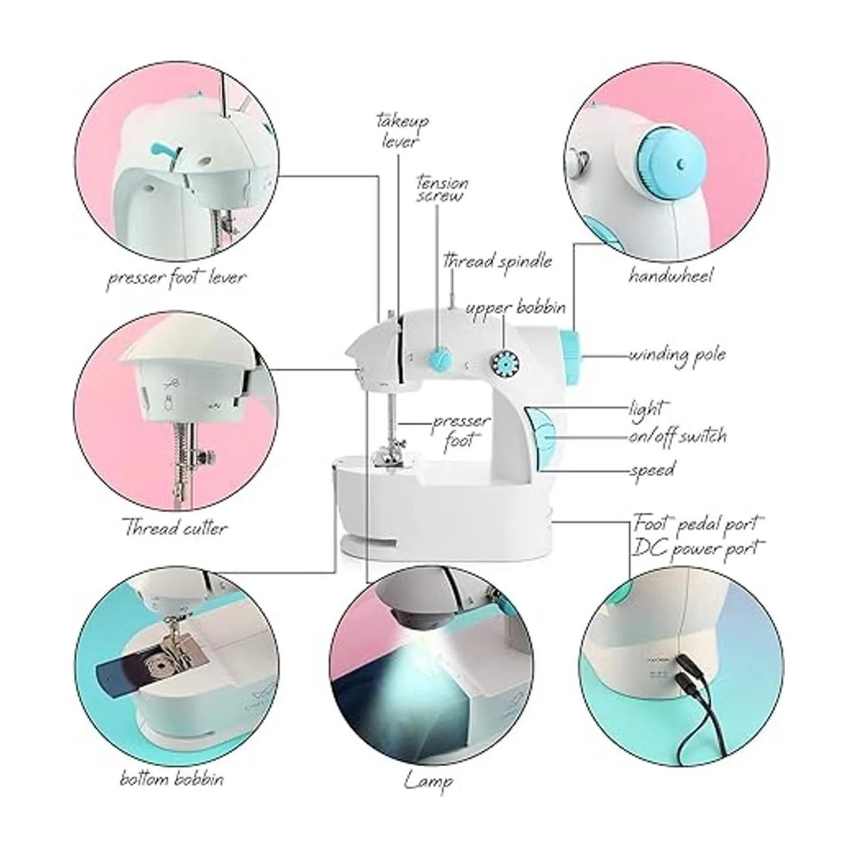 Máquina de coser para principiantes: nuestra máquina de coser para niños de 8 a 12 años incluye las siguientes inclusiones de kit de costura: un libro de guía de proyectos de costura, 16 carretes de hilo coloridos, 16 bobinas roscadas, 4 bobinas de repuesto y 5 agujas de máquina, dedal, enhebrador de agujas, rascador de costuras, tijeras de hilo y cinta métrica.