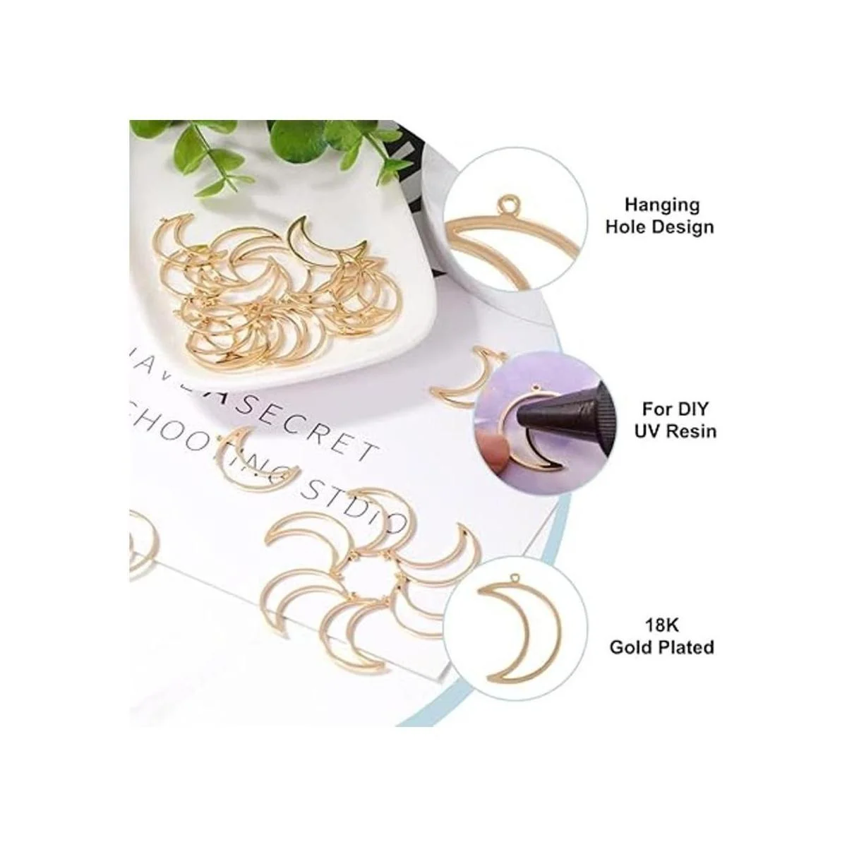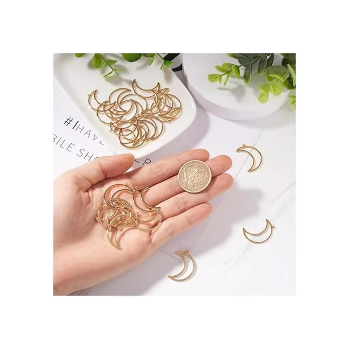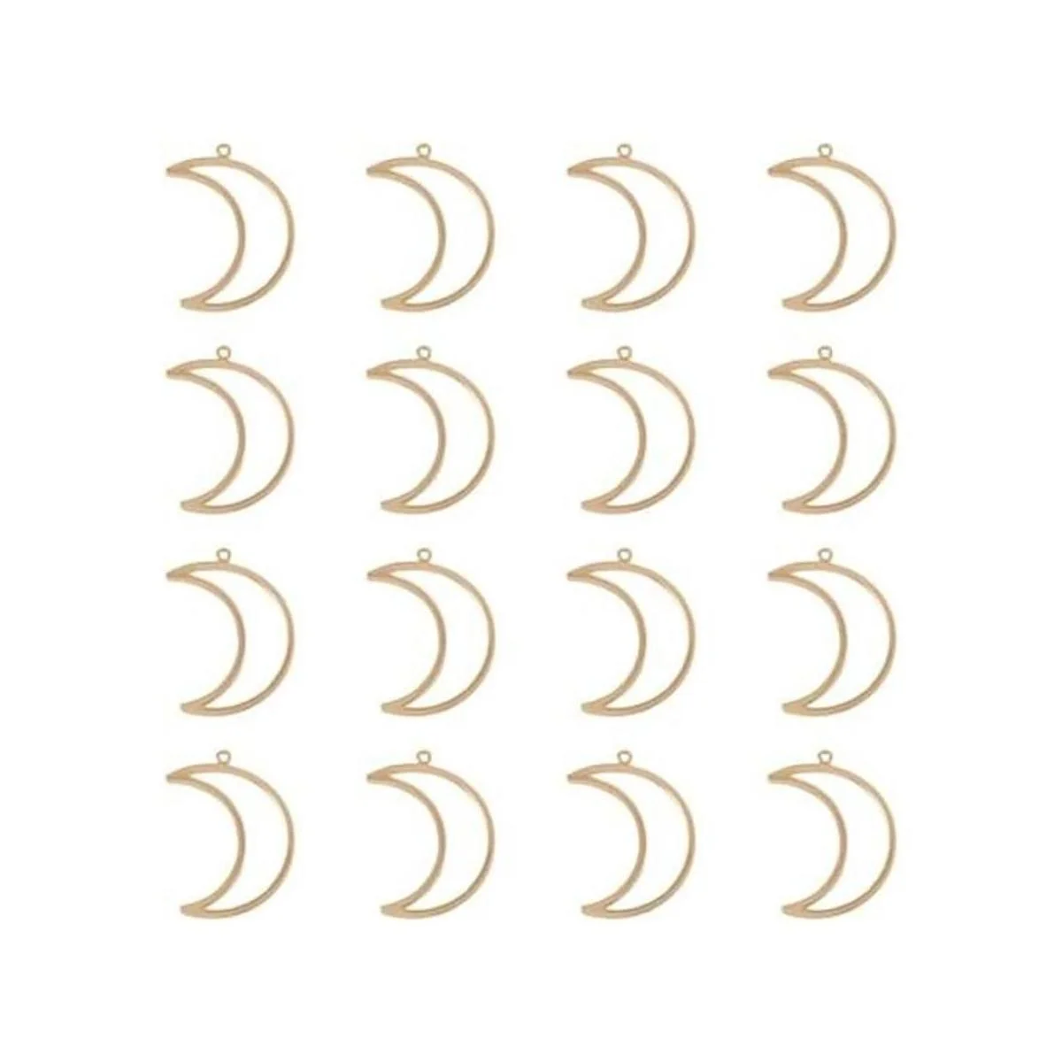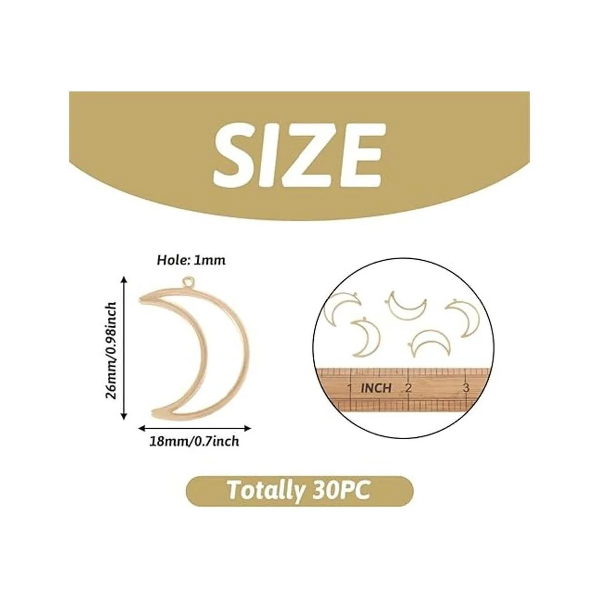 El paquete incluye: 30 colgantes de luna creciente, aproximadamente 1.024 in de largo, 0.709 in de ancho, 0.039 in de grosor, agujero: 0.039 in.