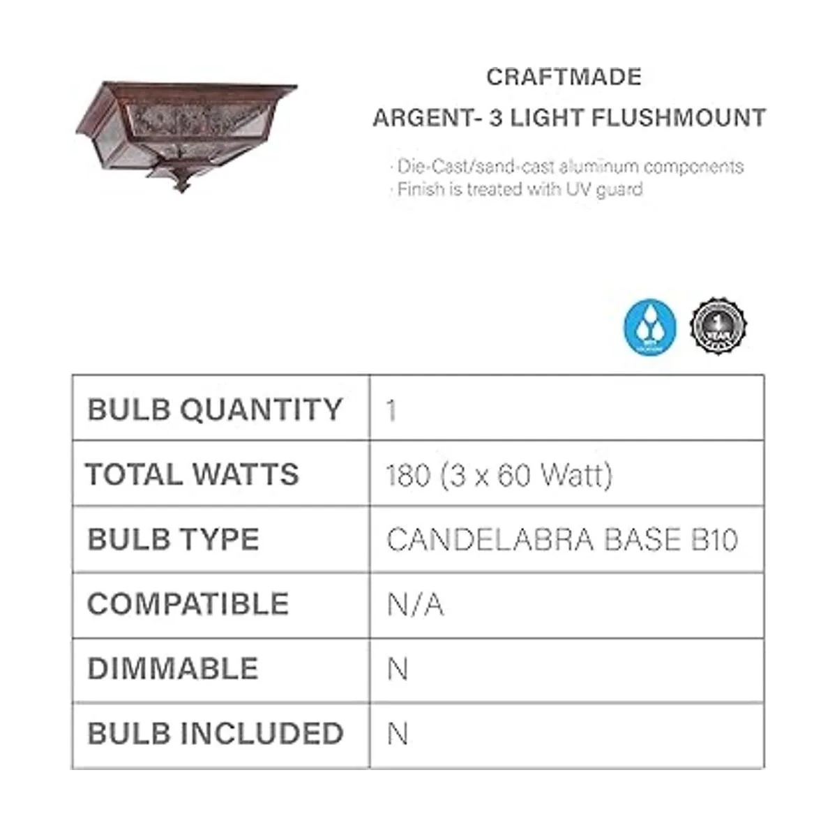 Iluminación: bombilla incandescente de candelabro de 3 a 60 W, no incluye bombillas, 180 vatios en total