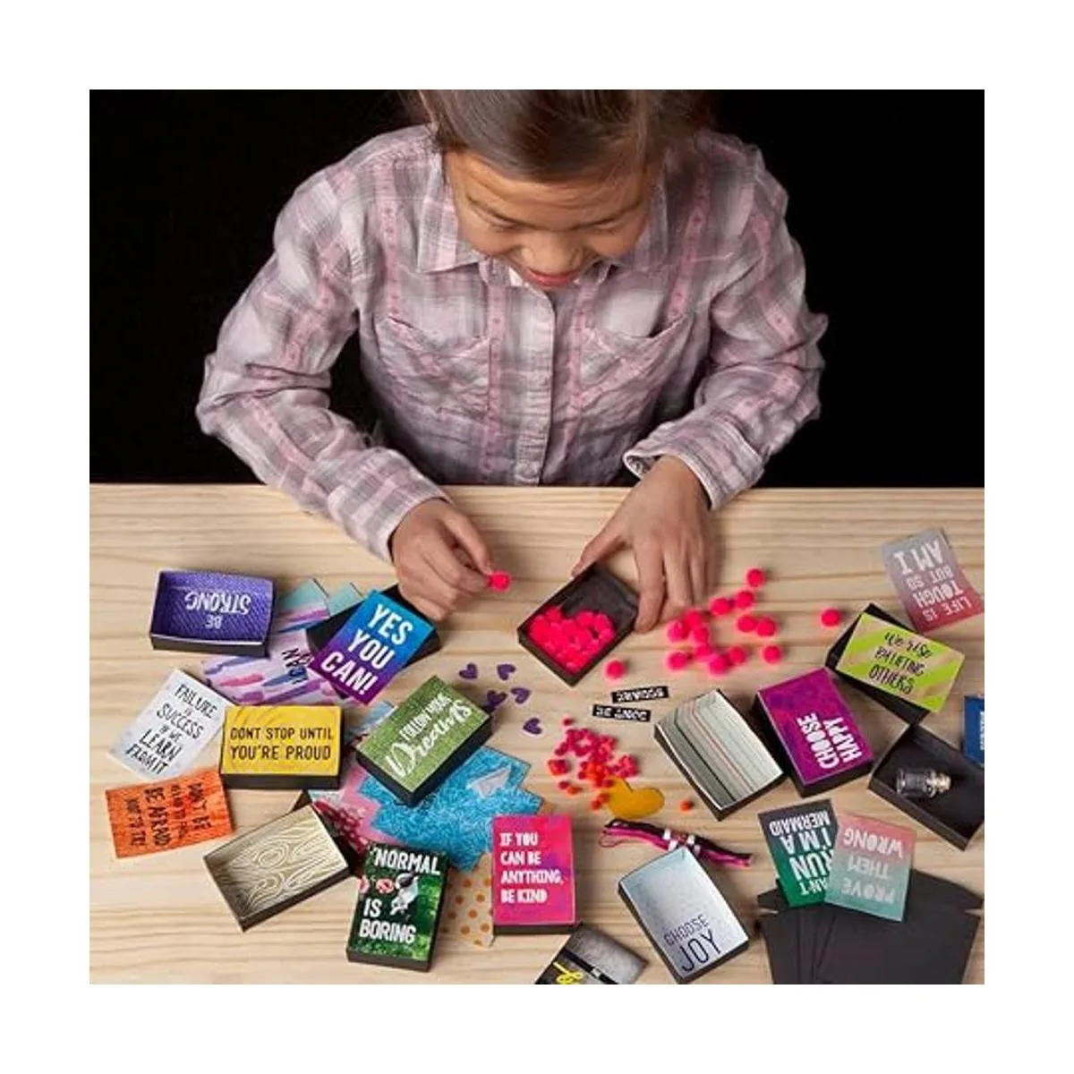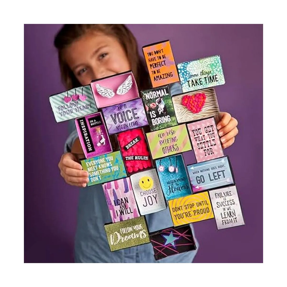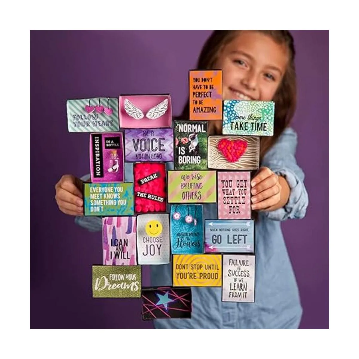 Fácil de hacer: coloca las citas a lo largo de pompones, corazones, banderas, estrellas, plumas y más dentro o fuera de las 22 cajas pequeñas. Organízalos de la manera que desees.