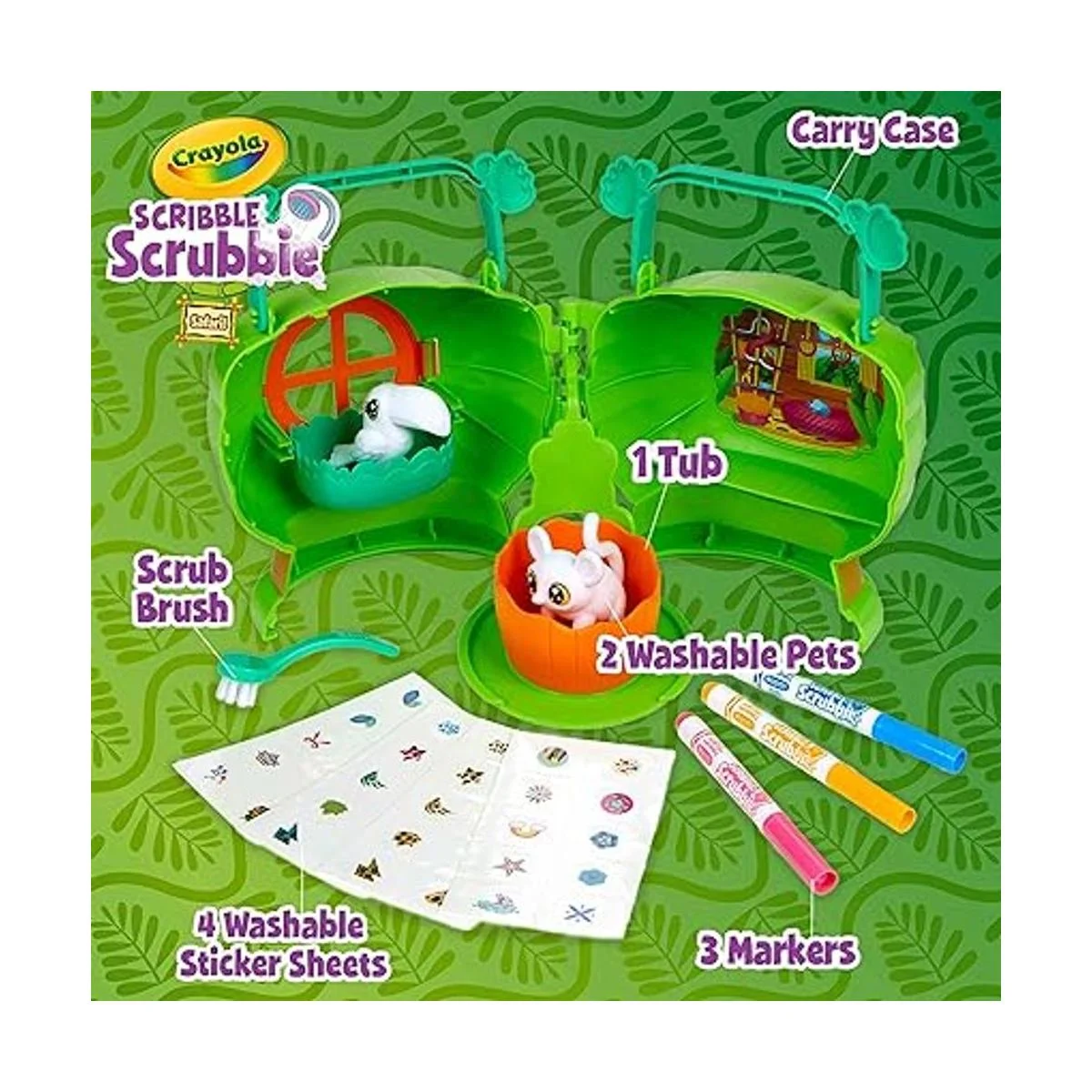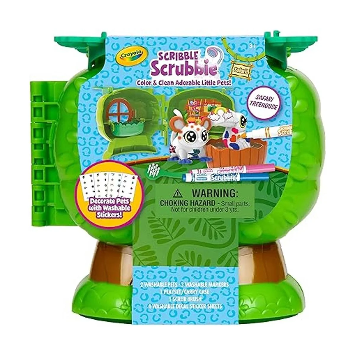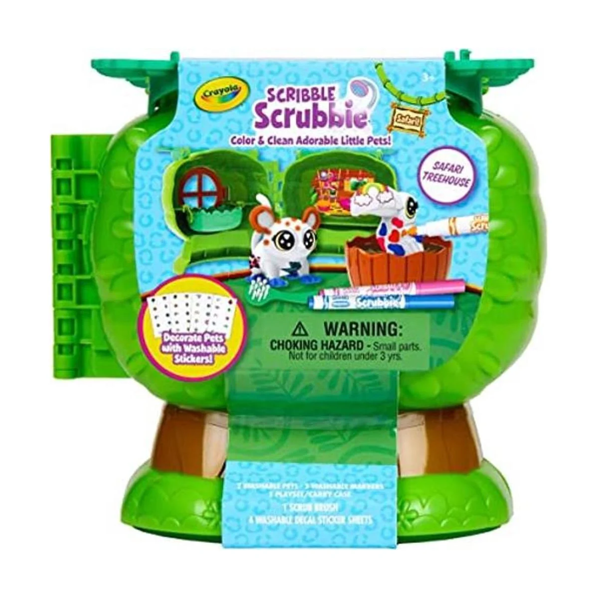 CRAYOLA SCRIBBLE SCRUBBIE SAFARI PETS TREEHOUSE: Incluye 1 caja de almacenamiento de plástico con asas plegables, 2 nuevas mascotas Safari, 4 hojas de calcomanías, 3 marcadores, 1 cepillo y 1 bañera de plástico.