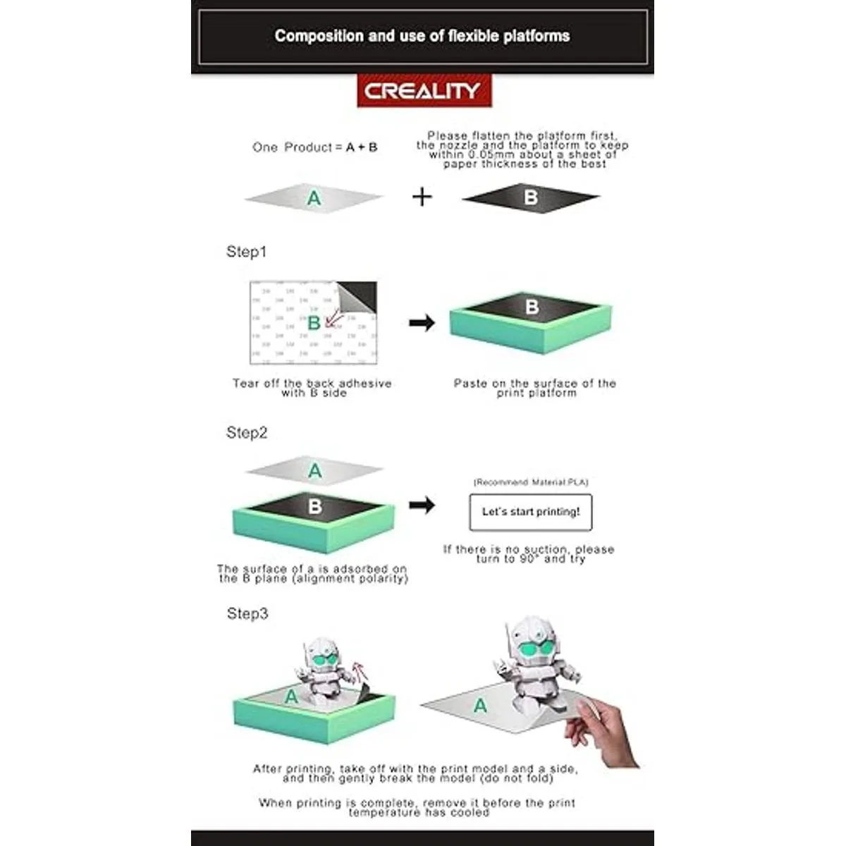 Excelente planitud: la superficie de construcción magnética de la impresora 3D Creality proporciona la superficie de construcción más plana del mercado, asegurando una alta planitud para la parte inferior de la impresión, asegúrate de que el modelo se pueda fijar firmemente a la superficie de la plataforma de impresión.