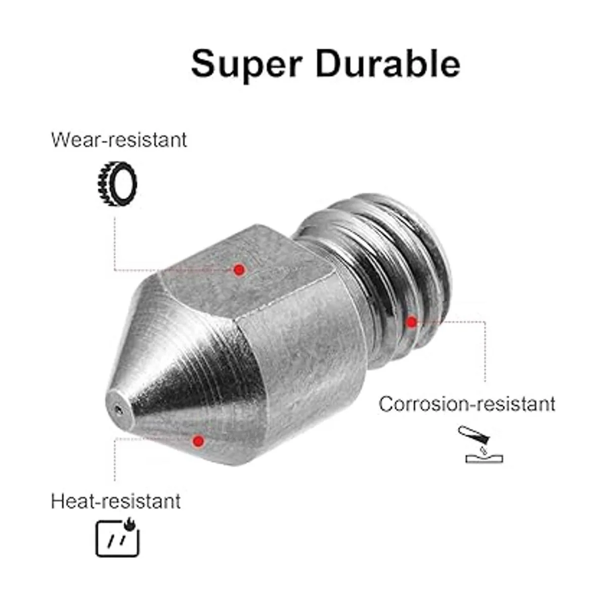 Resistencia a altas temperaturas: la temperatura máxima de esta boquilla de acero endurecido puede alcanzar a 842.0 F, adecuada para impresión 3D a altas temperaturas, compatible con materiales como PLA, ABS a fibra de carbono, incluso PEEK.