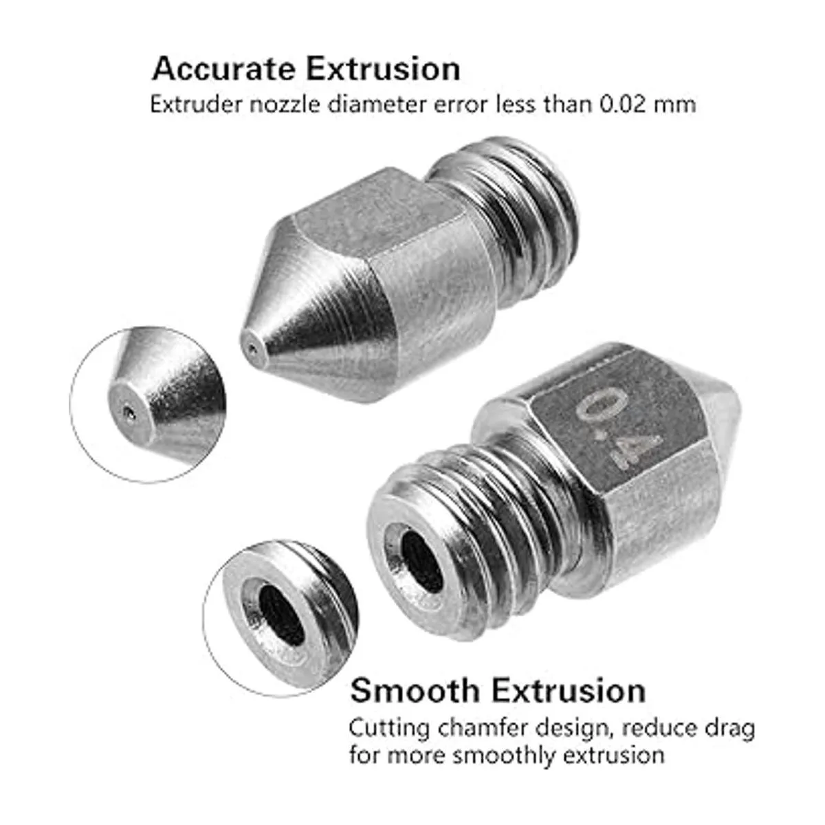 Alta precisión más que tu imaginación: mantiene la temperatura estable durante la impresión, deja que el filamento salga uniformemente, crea un artículo de impresora más perfecto que la boquilla de metal normal. También con mayor velocidad de impresión en la misma precisión de impresión. Evita obstrucciones durante la impresión, fácil de limpiar. Fabricado con torno automático de precisión CNC centrado y con tecnología de formación única, asegúrate de que los agujeros de entrada y salida sean concéntricos y el interior de la boquilla sea suave sin rebabas.