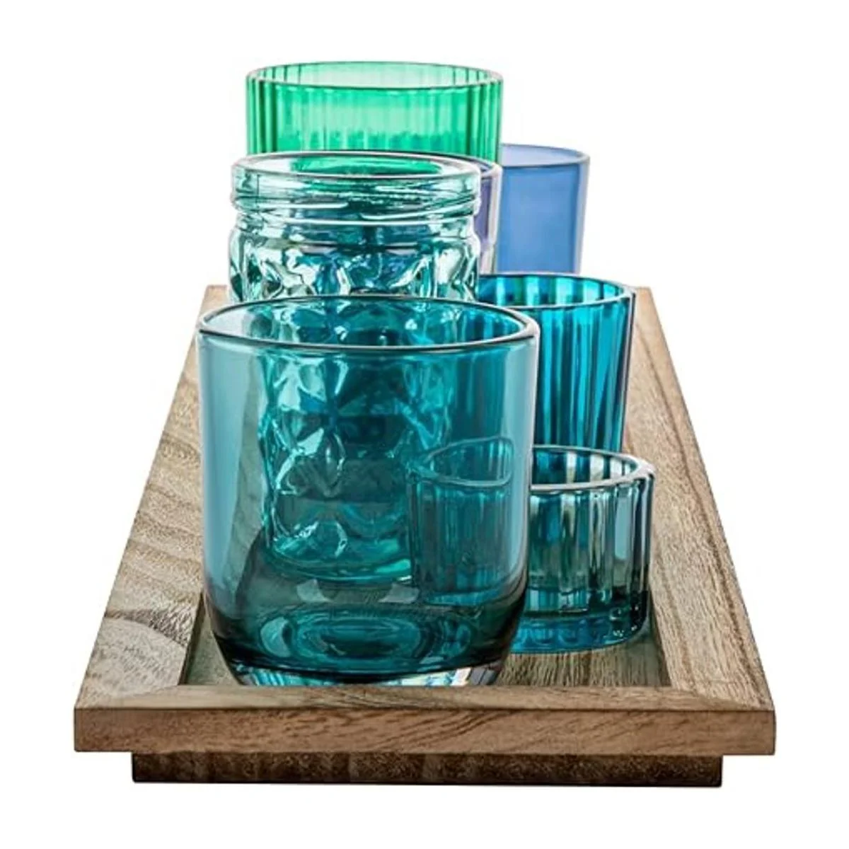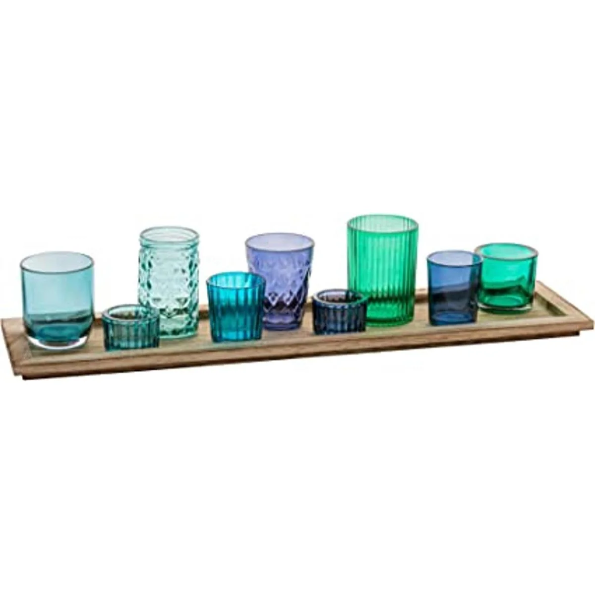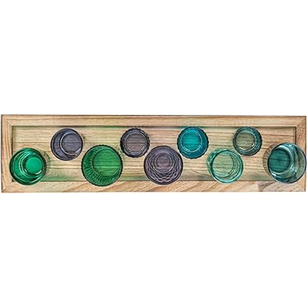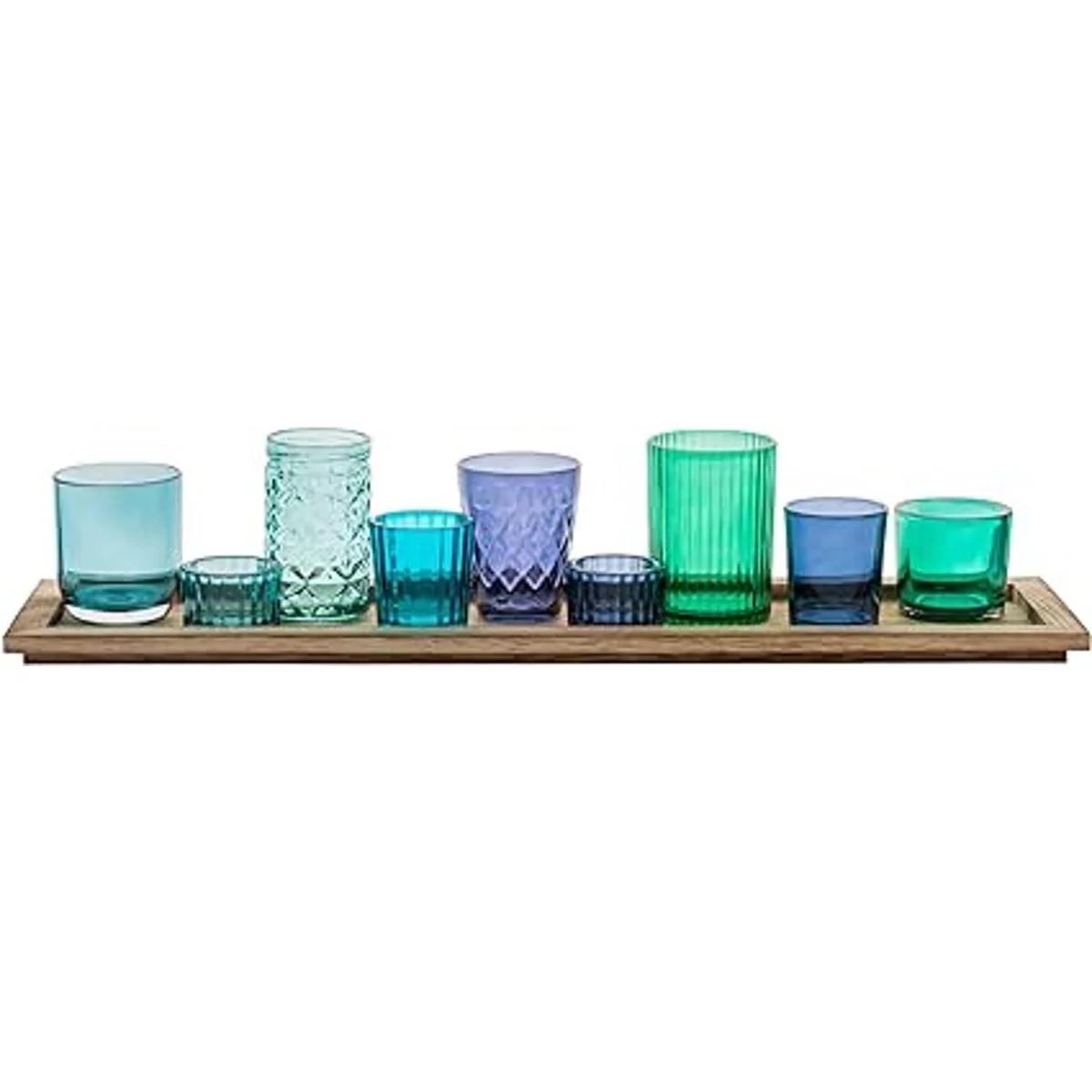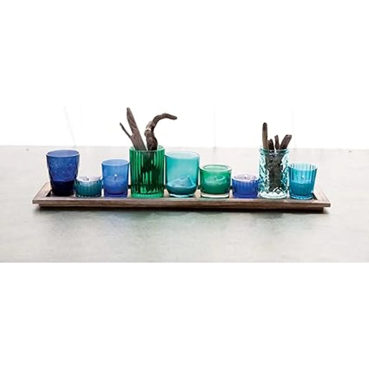 Creative Coop Bandeja de madera con 9 portavelas votivos de vidrio, 22 x 5.5 pulgadas, color beige neutro
