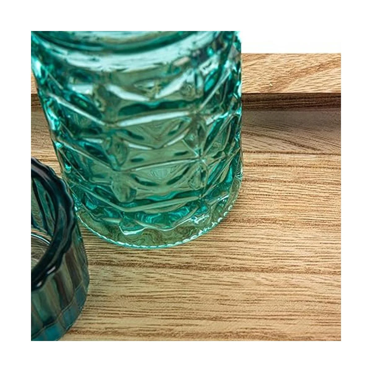 Los portavelas están hechos de vidrio y la bandeja es de madera