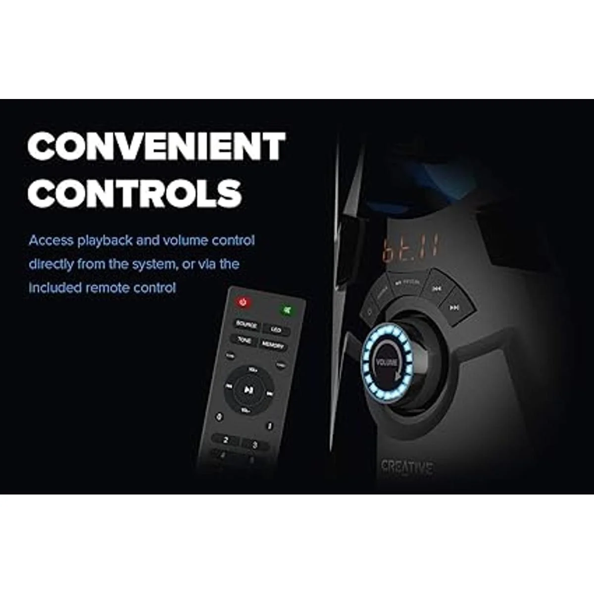 Prácticos botones de control con control remoto: accede fácilmente a la reproducción de música y al control de volumen directamente desde los botones de control frontal del sistema, o utiliza el control remoto infrarrojo incluido para ajustar la configuración de audio del altavoz y la reproducción de música de forma inalámbrica. Puedes personalizar aún más el audio con los controles de agudos y graves en el control remoto para adaptarse al género de audio que estás escuchando o para adaptarse al estado de ánimo en el que estás en